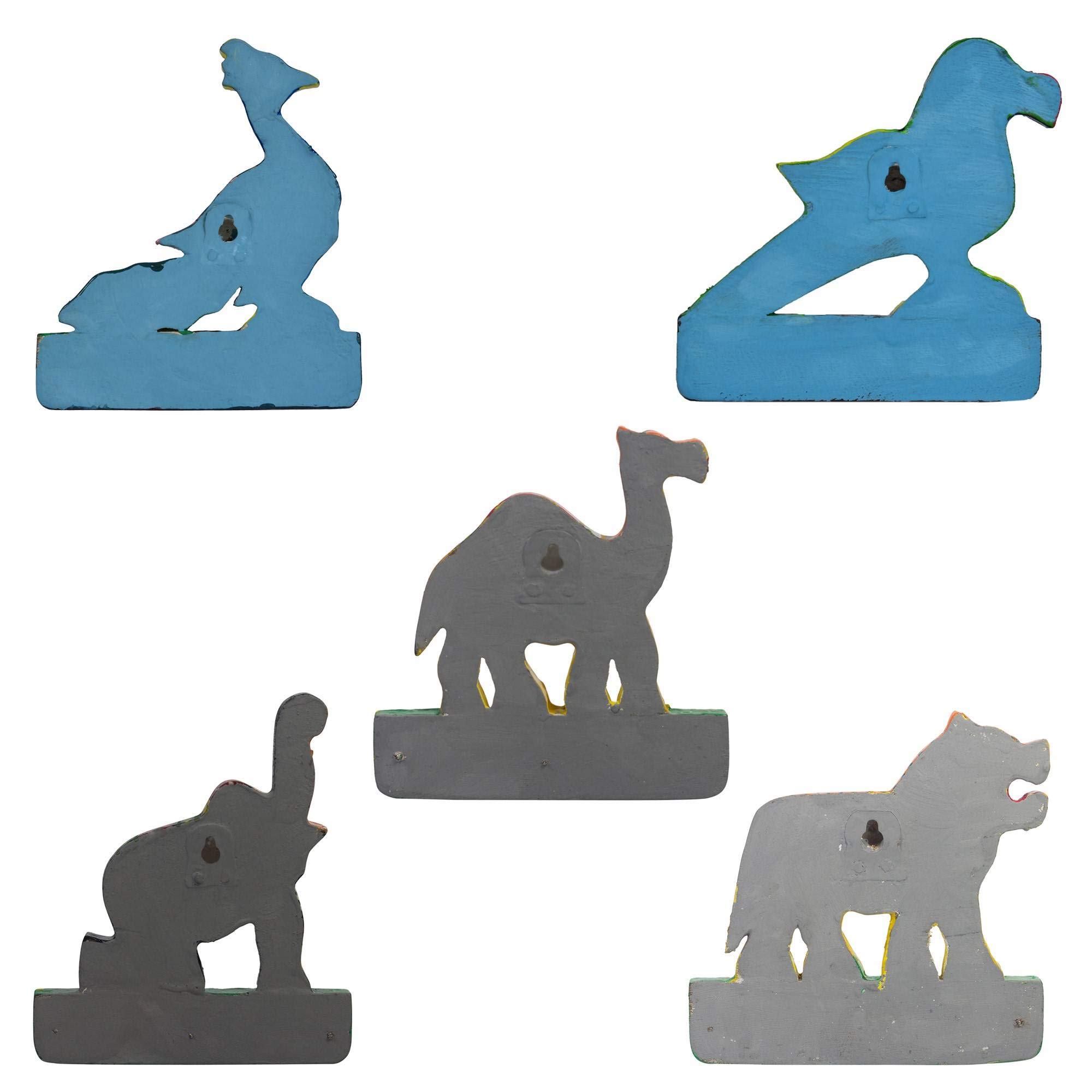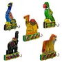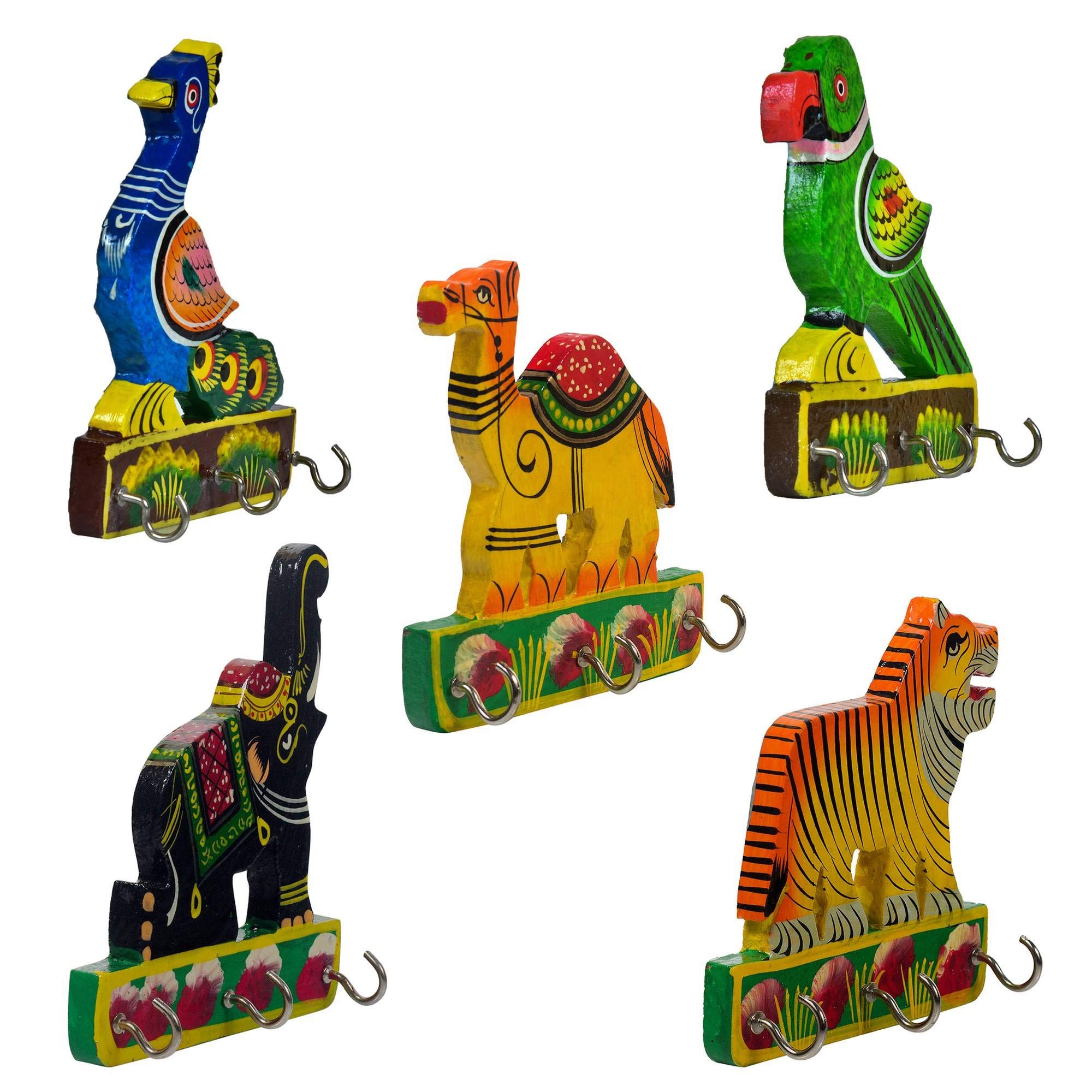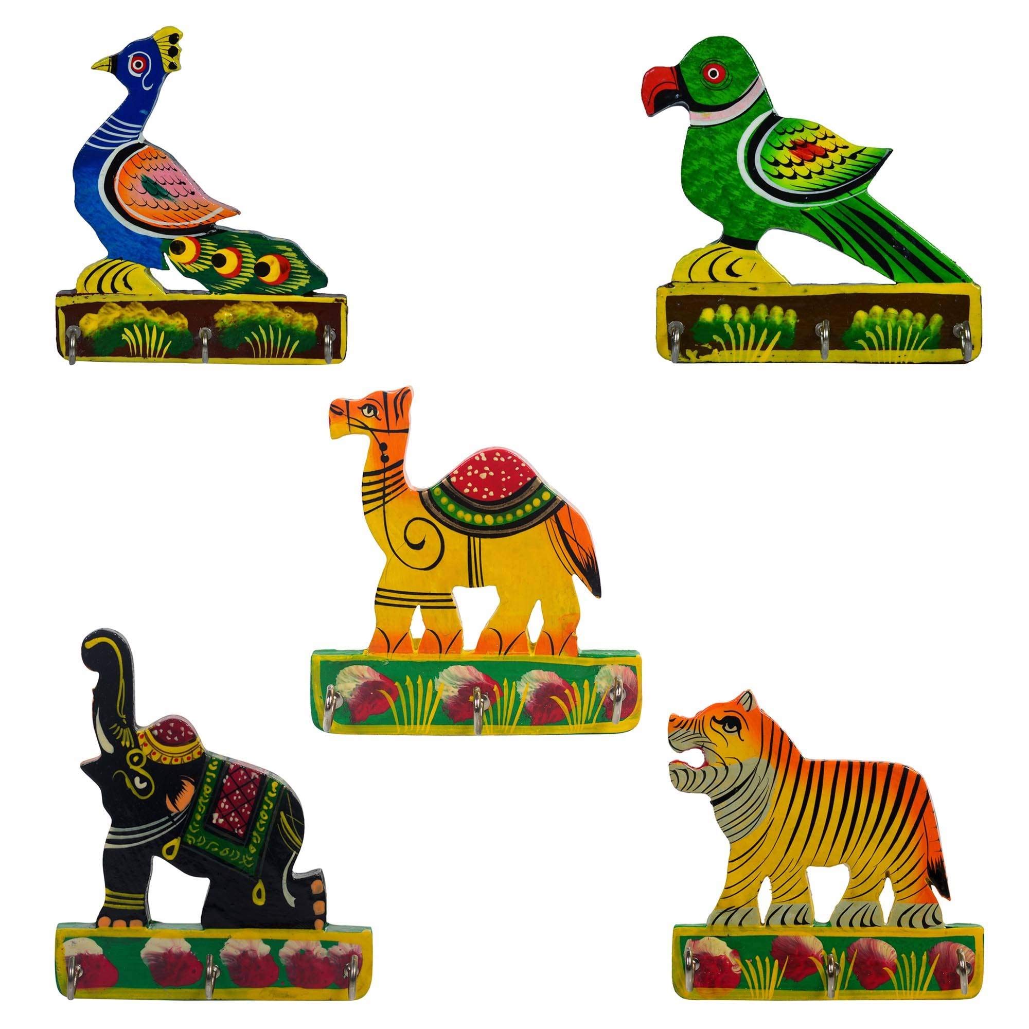 VARANASI WOODEN TOYS Combo of Beautiful Wooden Wall Hanging Colourful Key Holder in Camel Peacock Parrot Elephant and Tiger Shape (Set of 5)