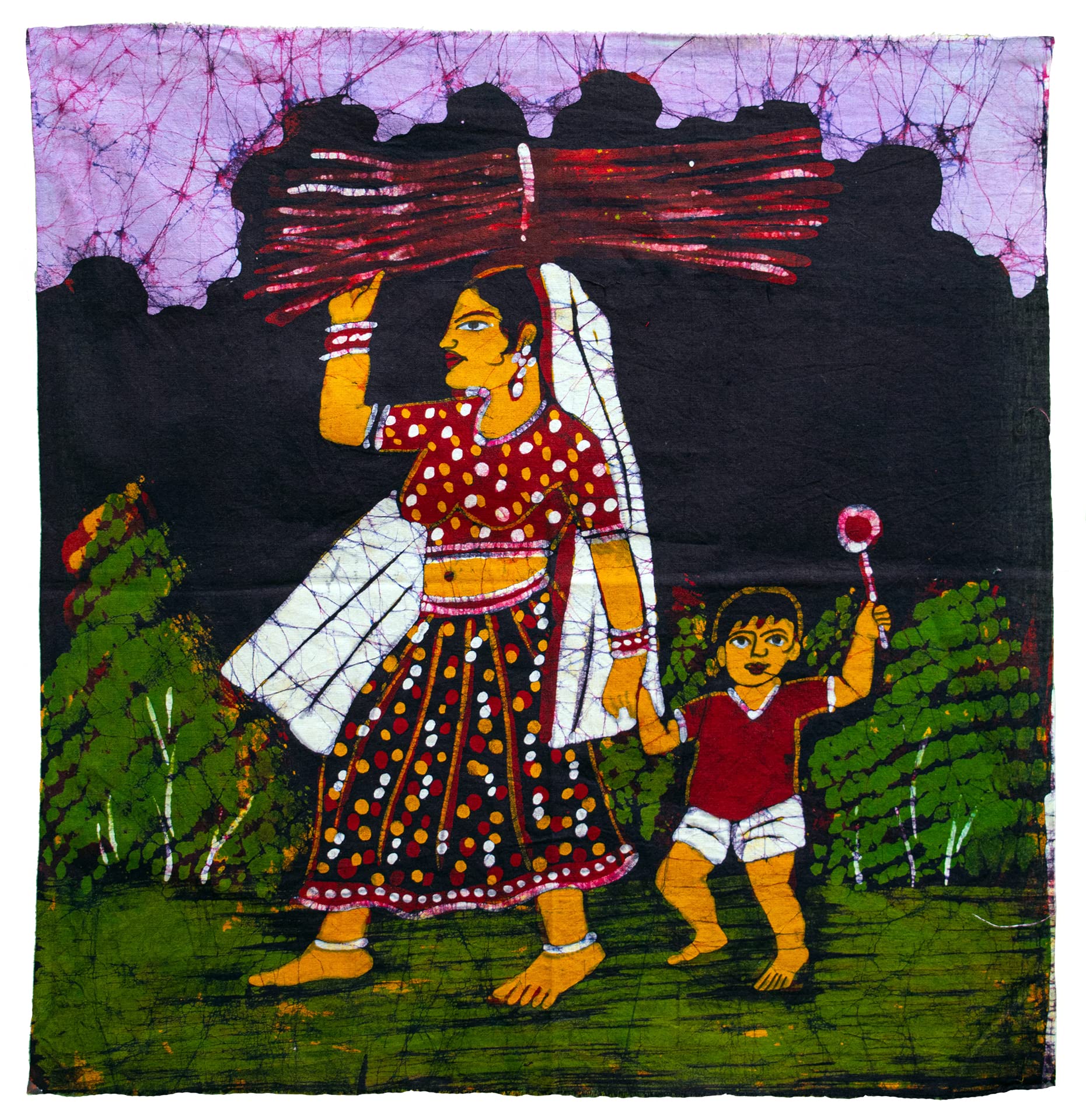 PAPIER MACHE MASK OF GODS - Mother and Her Child Batik Painting on Cloth Unframed (19 x 18 in)