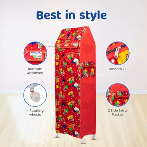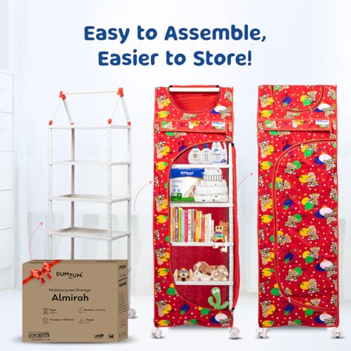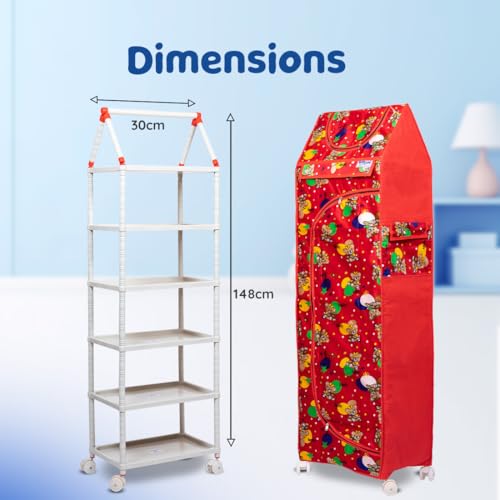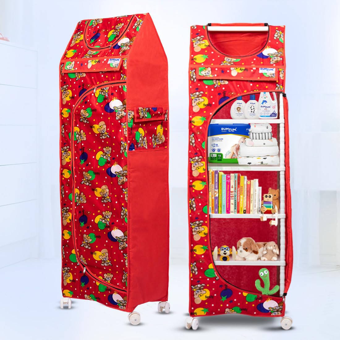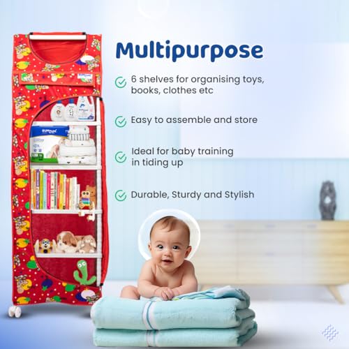 Bumtum Baby Wardrobe Multipurpose 6 Shelve |Foldable Almirah| Baby Wardrobe for Clothes Storage | Baby Wardrobe Cover | Baby Almirah with Wheels (Red)