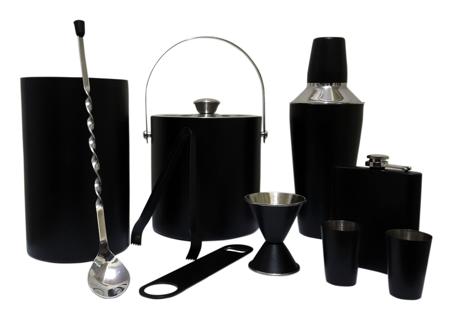 Includes:- cocktail shaker double sided peg measure bottle opener ice bucket ice tong wine cooler hip flask 7oz 2 shot glasses 1 bar spoon