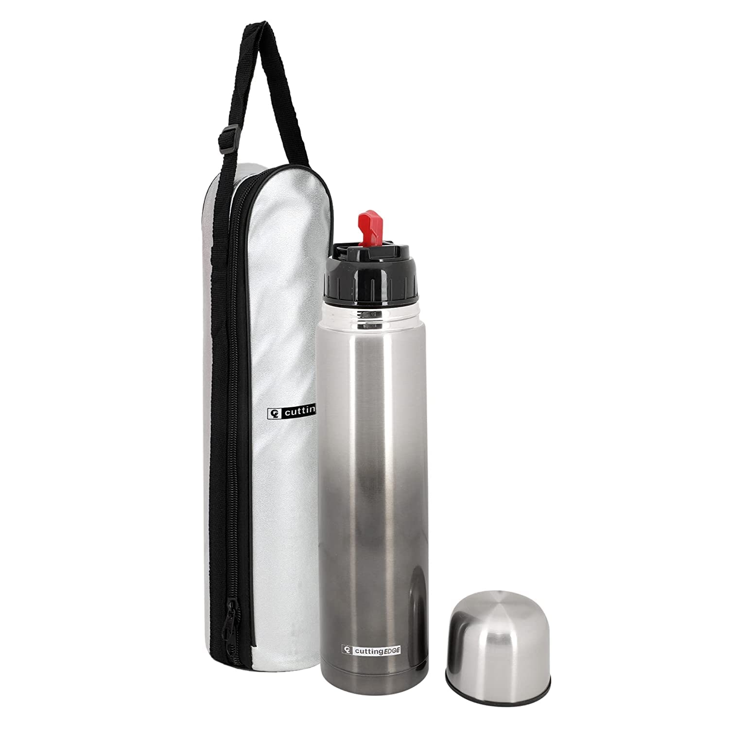 HomeKitchenContainersBottlesCutting EDGE Stainless Steel Bullet Design Flask Bottle with Bag/Cover Features Flip Lid Insulated Flask Thermos (Silver Black 500 ML)