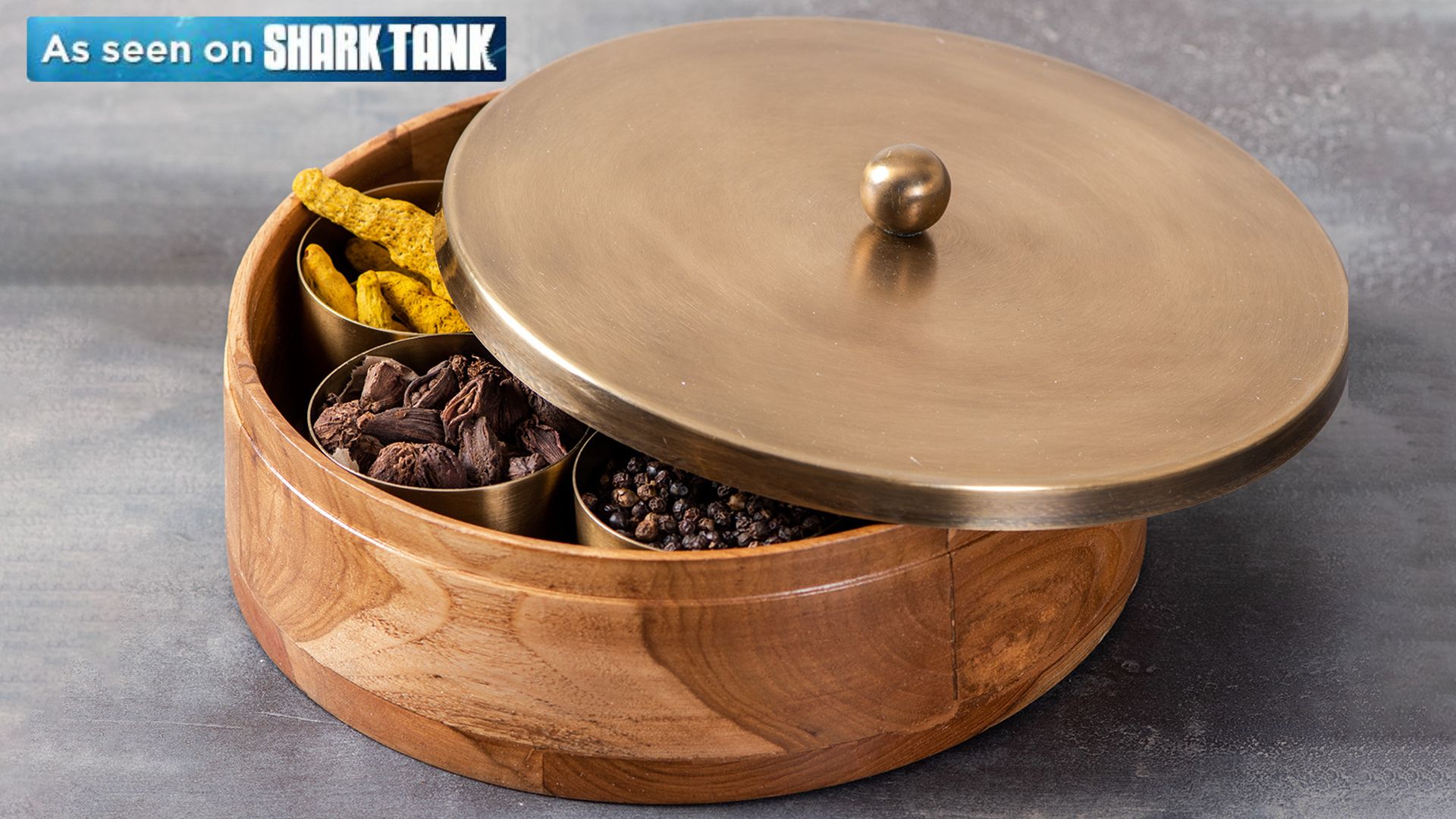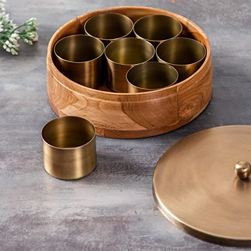 HomeKitchenContainersJars & ContainersDry Fruits Box with Dabba Jars for Kitchen | Round Powder Container Set with lid for Storage Tabletop |Mango Wood Gold (7 Jars)
