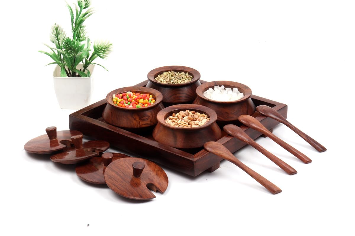 HomeKitchenContainersJars & ContainersWOOD CRAFTS OF RAJASTHAN Premium Wooden Mukhwas Mouth Freshner Handi Jars Set Of 4 with Handcrafted Embellishments - Mukhwas Storage
