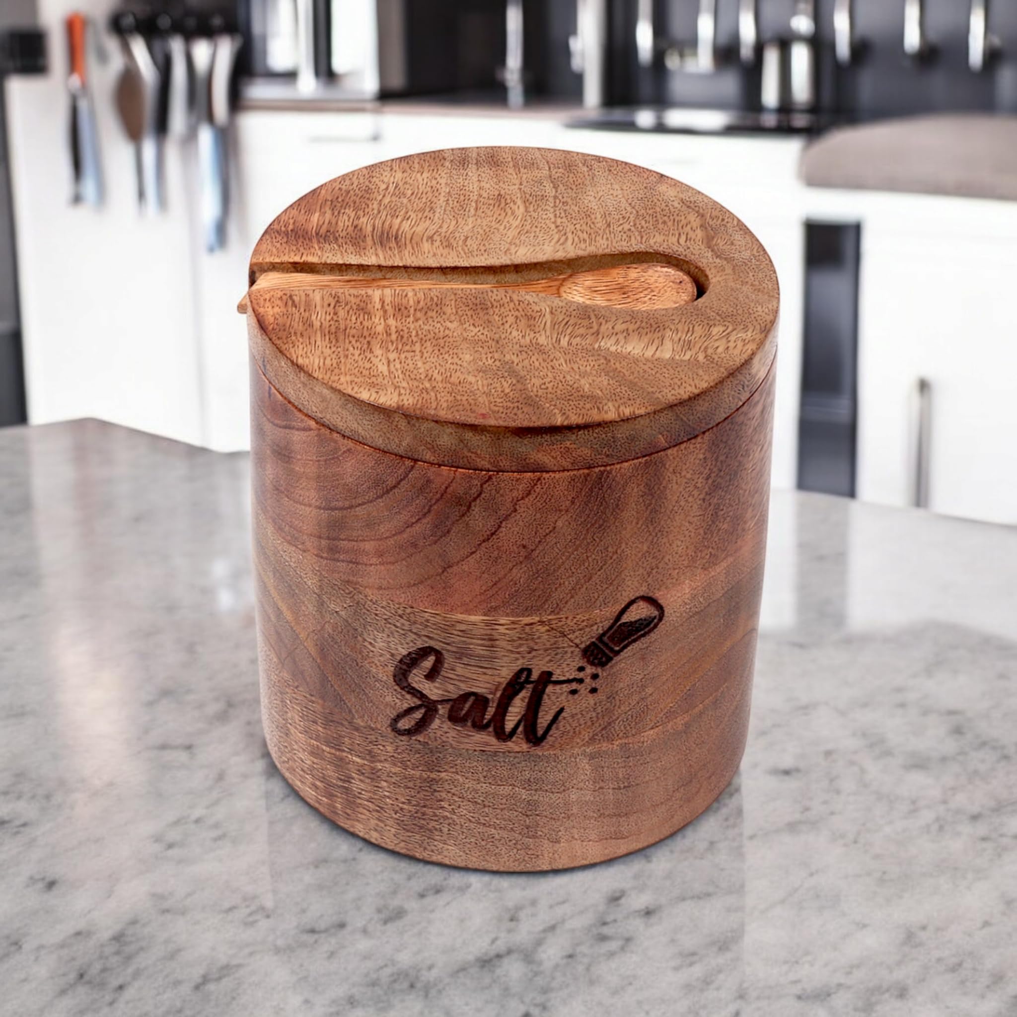 HomeKitchenContainersJars & ContainersWooden Salt Sugar Coffee & Tea Jars with Magnetic Lid & Wooden Spoon Round Salt Container Condiment Storage Jar Kitchen Spice Storage Jar - Mango Wood Crafted (Salt Jar (Outside Spoon))