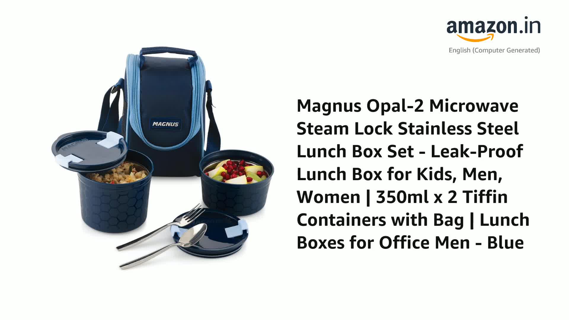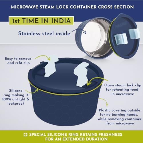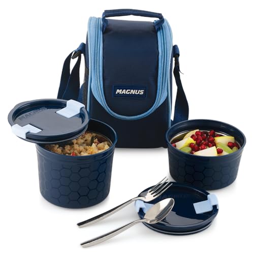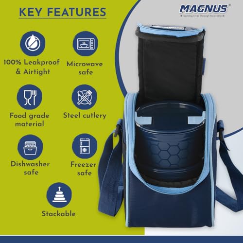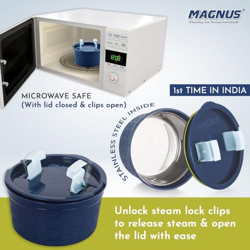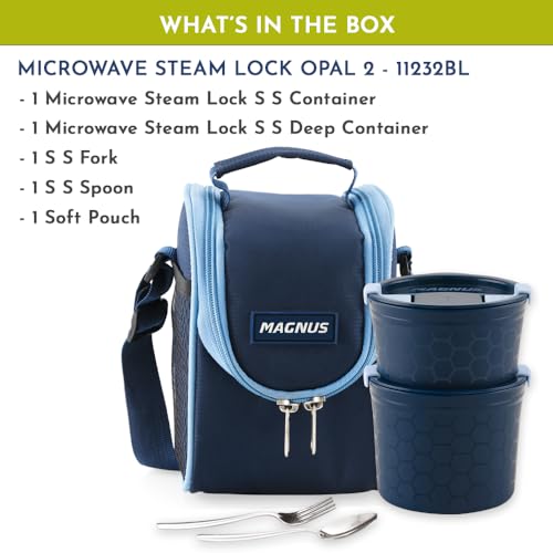 HomeKitchenContainersLunch BoxesMagnus Opal-2 Microwave Steam Lock Stainless Steel Lunch Box Set - Leak-Proof Lunch Box for Kids, Men, Women | 350ml x 2 Tiffin Containers with Bag | Lunch Boxes for Office Men - Blue