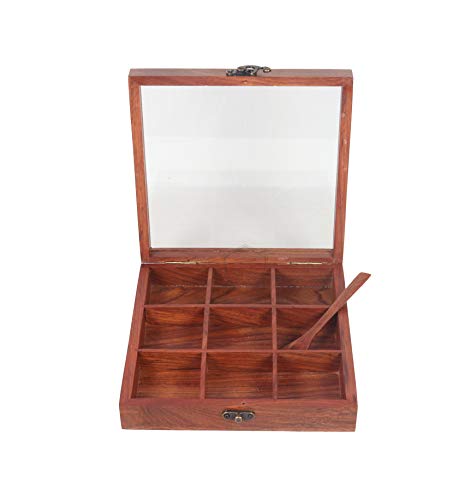 HomeKitchenContainersSpice BoxesCreation India Craft Wooden Spice Box Set for Kitchen Table Top Masala Dabba 9 Section/Partition Jars for Kitchen Storage Boxes Brown