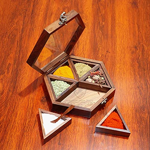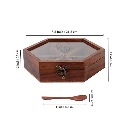 HomeKitchenContainersSpice BoxesWooden Spice Box Masala Dani, Spice Box for Kitchen Container Jars with Spoon in Sheesham Wood, Decorative Masala Dabba Organizer 6 Containers (Hexagon) 90 ML