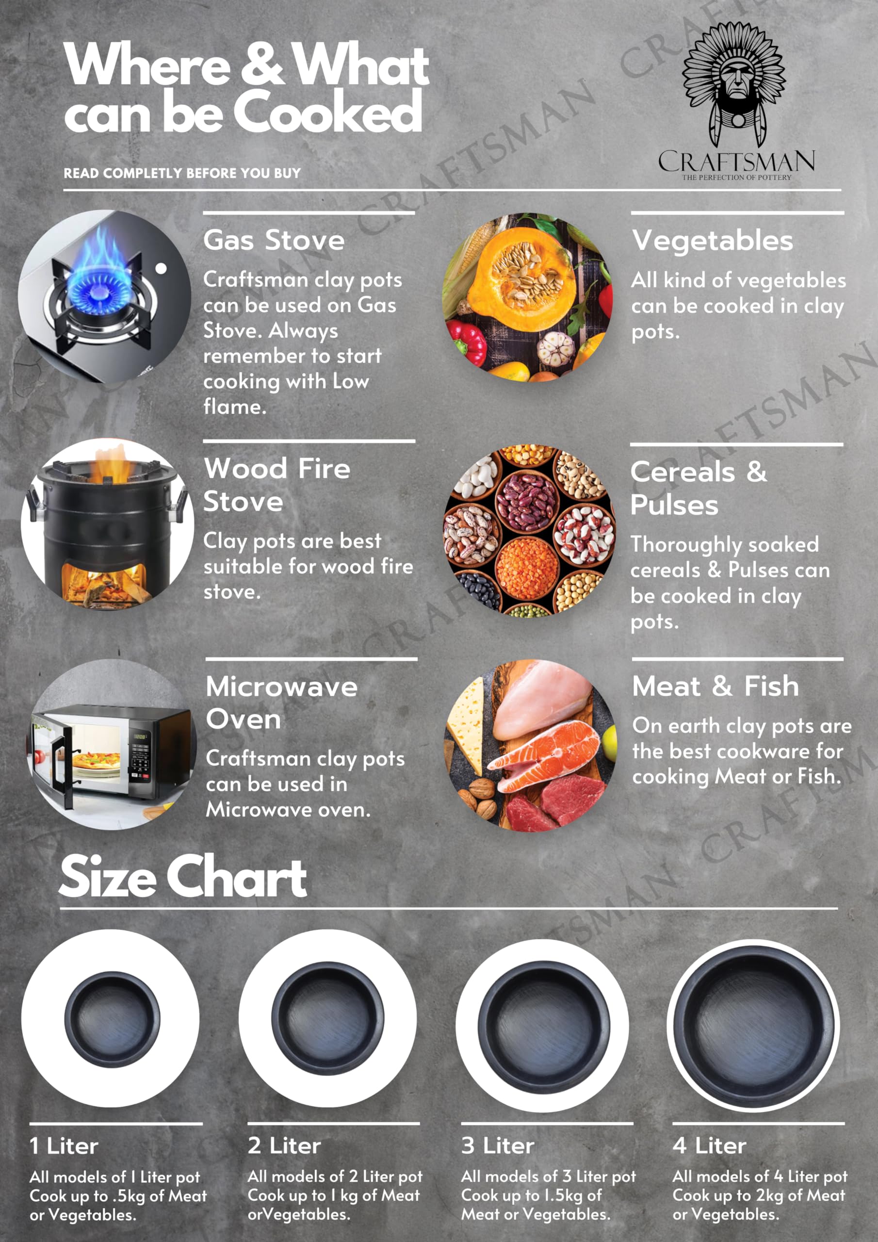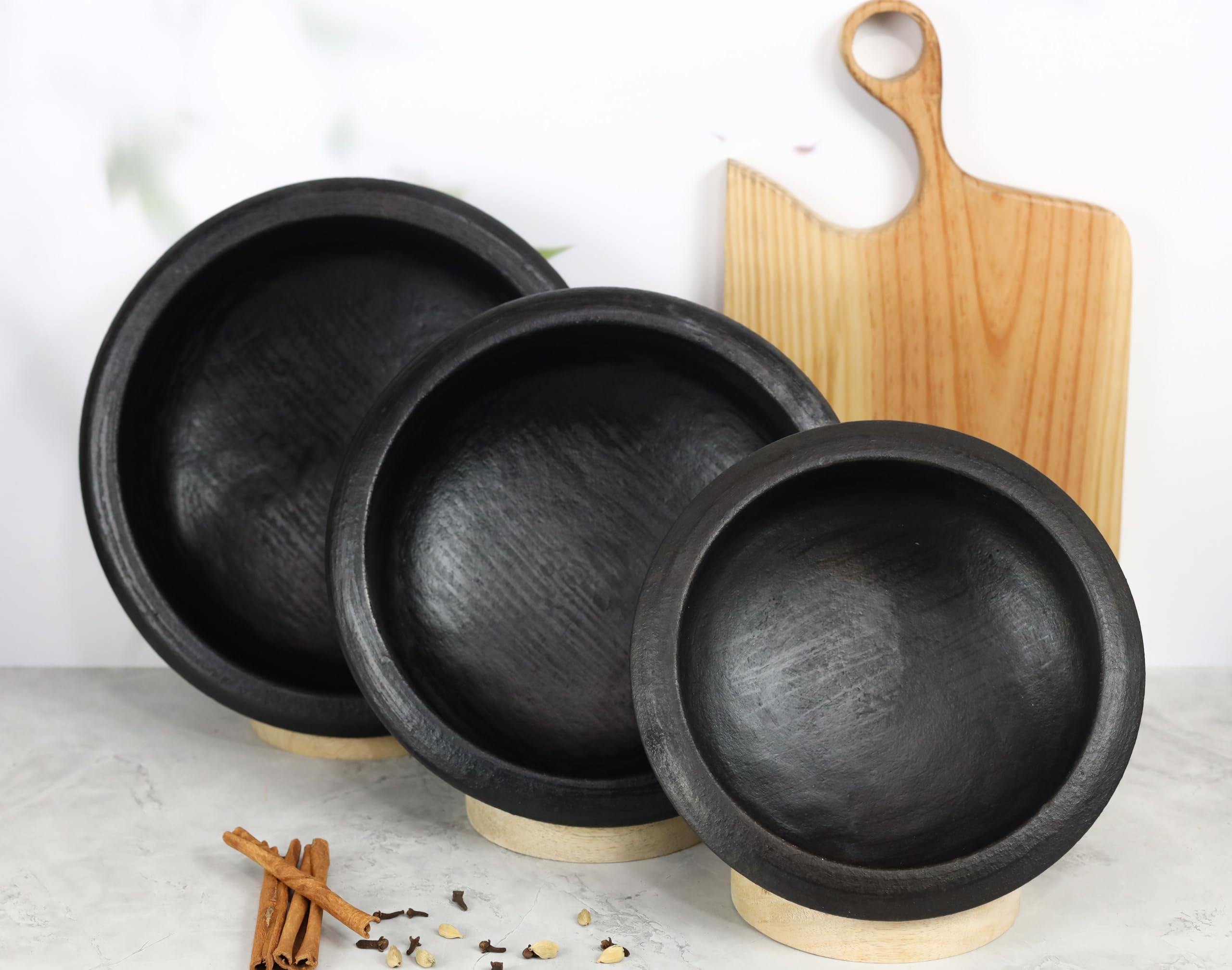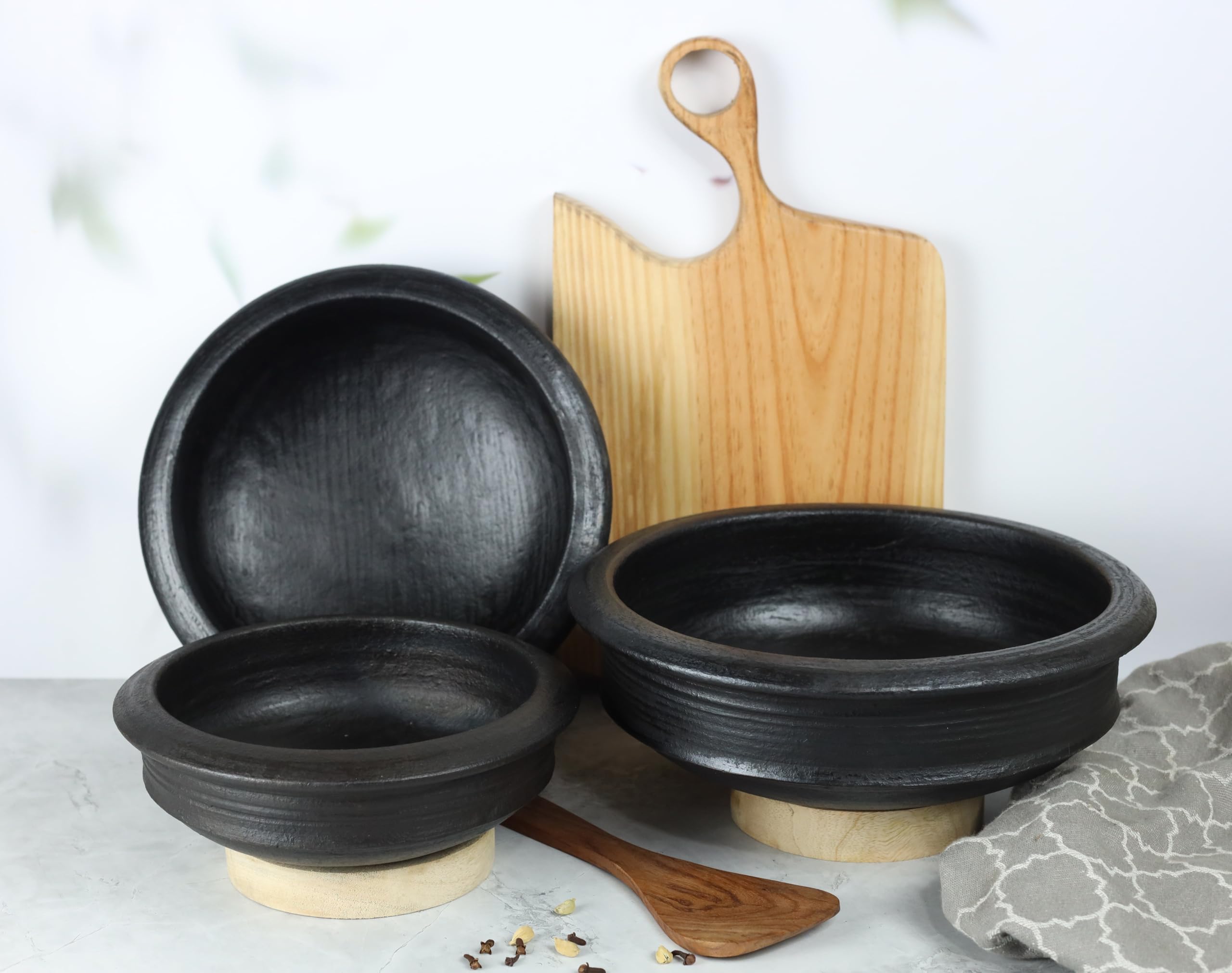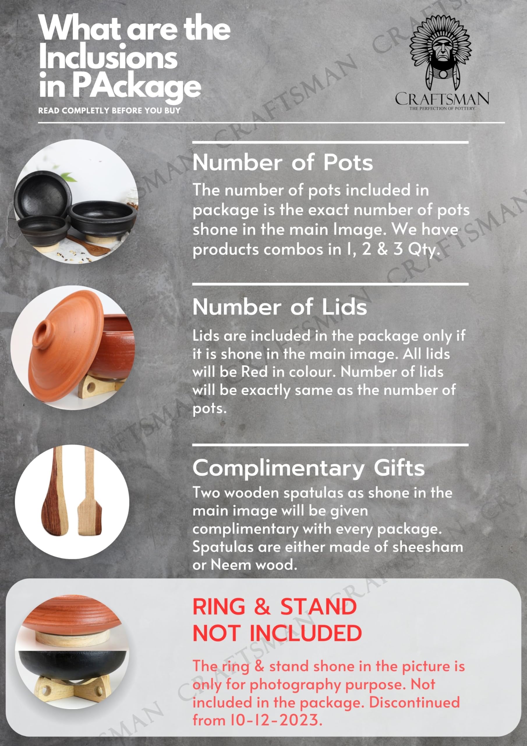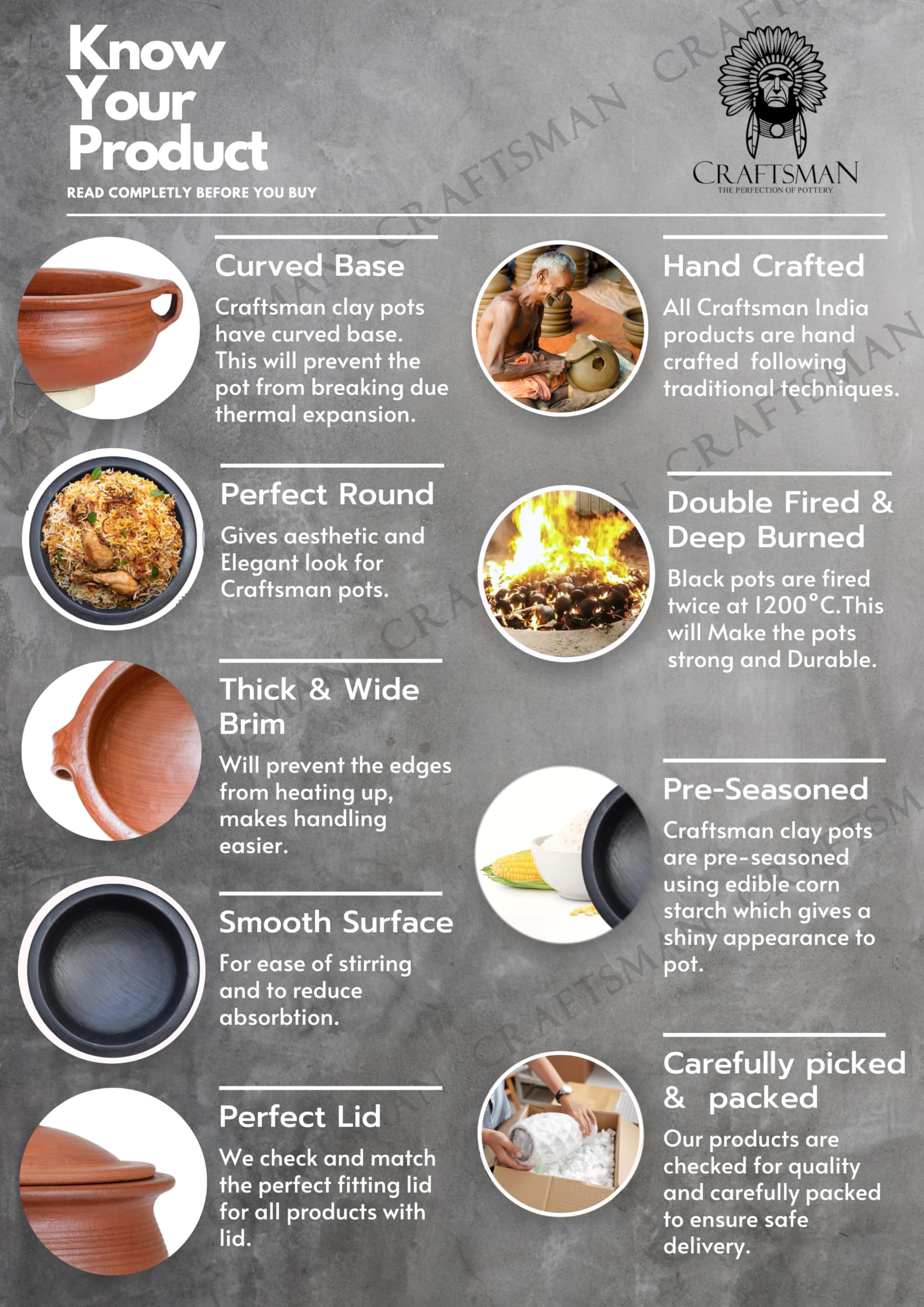 HomeKitchenTraditional CookwareHandisCraftsman India Online Deep Burned Clay Uncoated Pot/Earthen/Mud/Mitti Handi For Cooking And Serving Combo 1, 2 & 3 Liter, Black