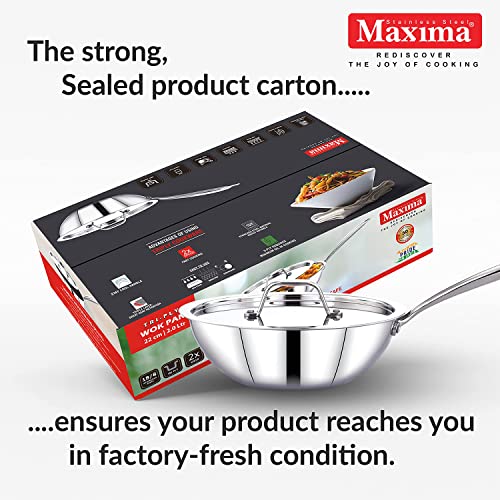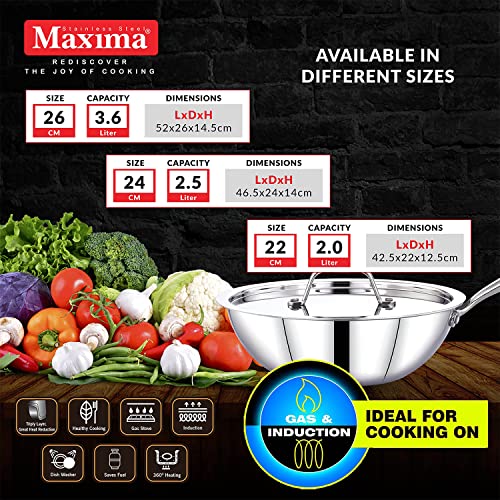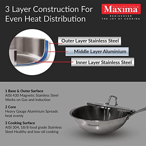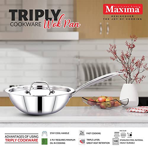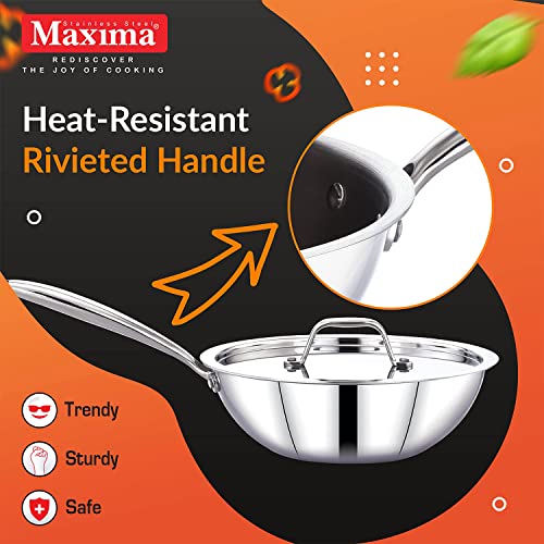 Maxima Triply Stainless Steel Wok Pan with Stainless Steel Lid Induction Bottom Cookware (26 cm 3.6 LTR)