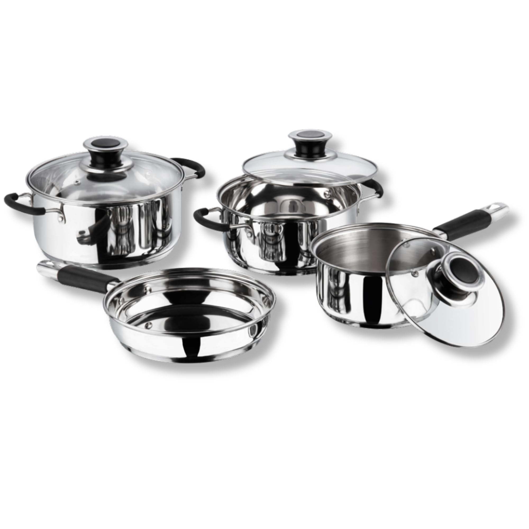 Material: Glass Stainless steel; Size: Saucepan - 1.5 L Saucepot - 2.1 L Saucepot - 3 L; Base Type : Gas Compatible and Induction Compatible; Included components: 2 Saucepot 1 Saucepan 1 Frypan and 3 Lid; Colour: Silver. Dishwasher Safe : Yes