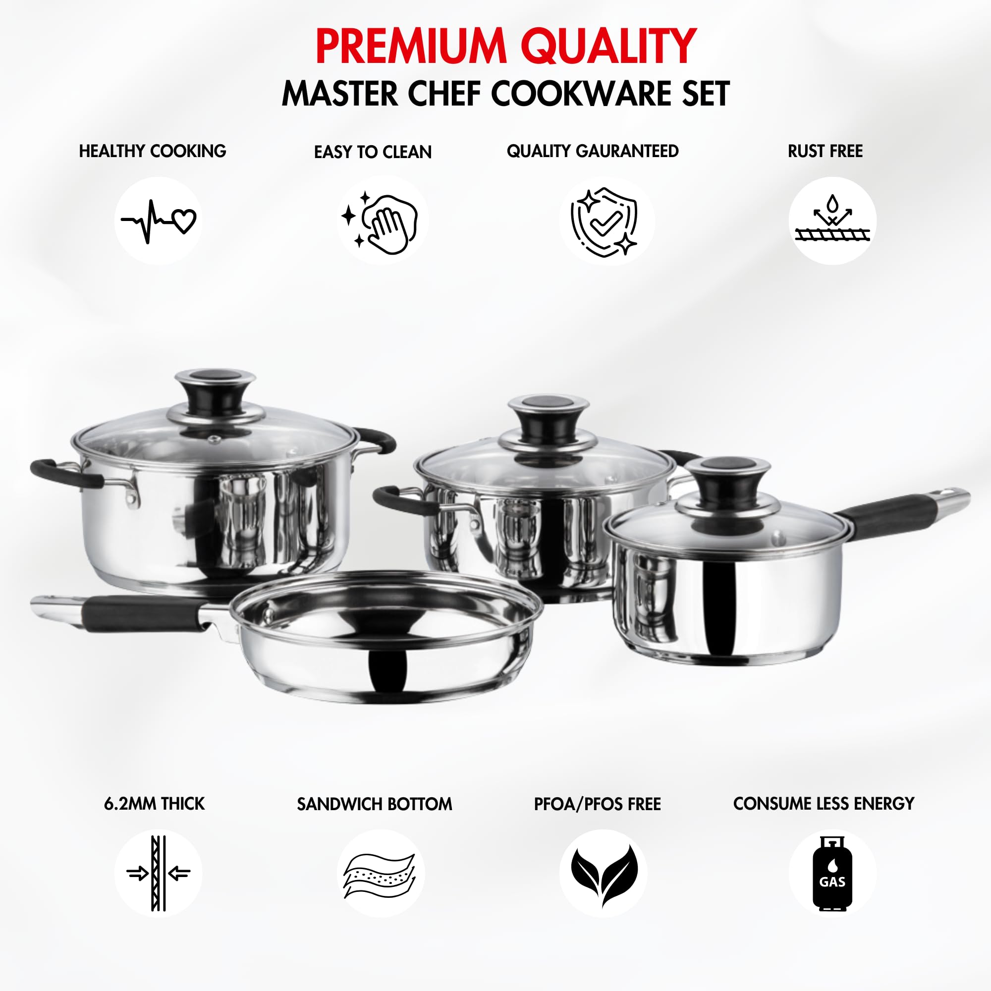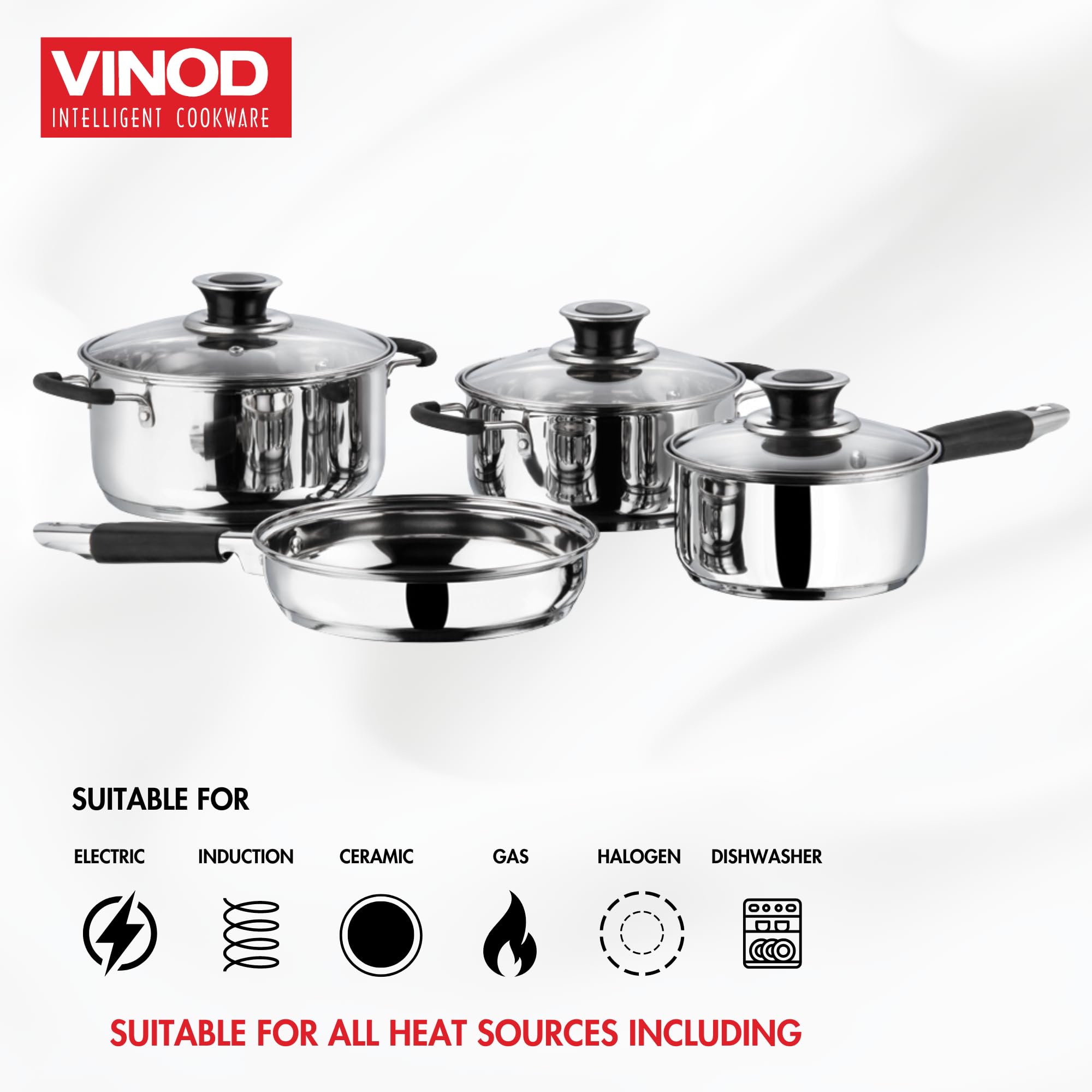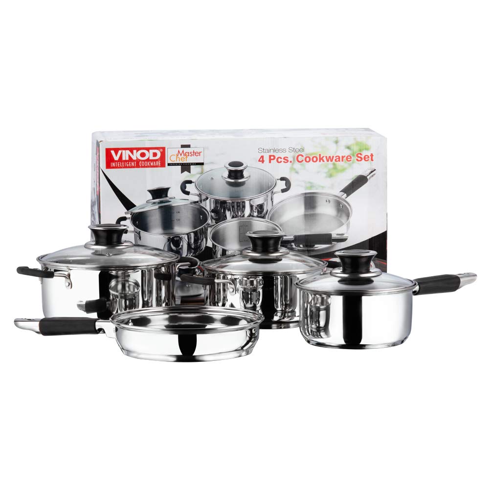 Vinod Stainless Steel Induction and Gas Stove Friendly Master Chef Cookware Set- 4Pieces, Saucepan (16 cm/1.5 Litre), Casserole (18 cm /2.1 L Kadai (20 cm/ 2 Litre) with Glass Lids, Frypan (20 cm)