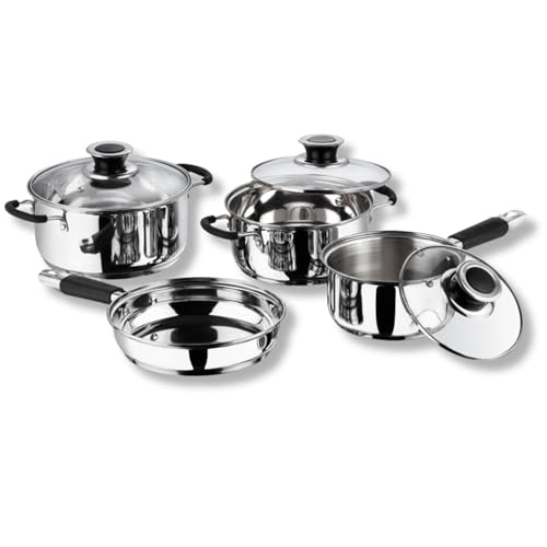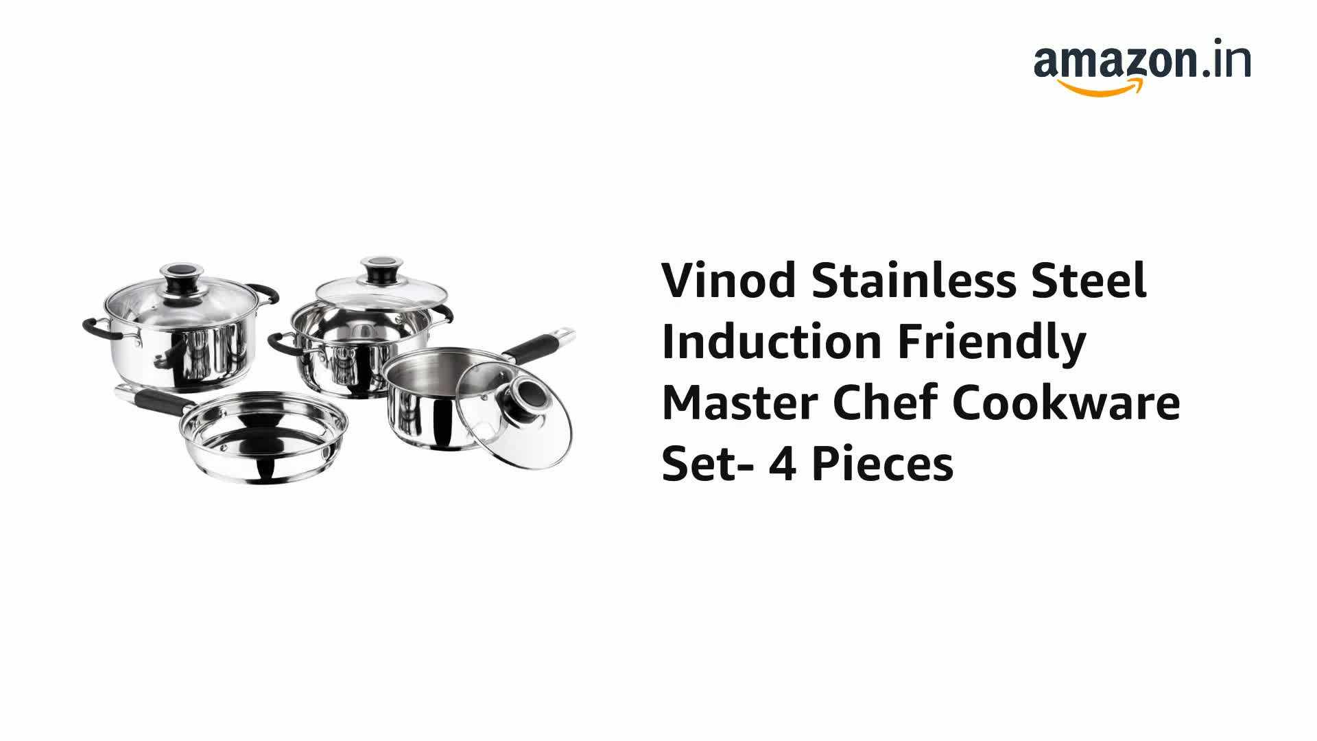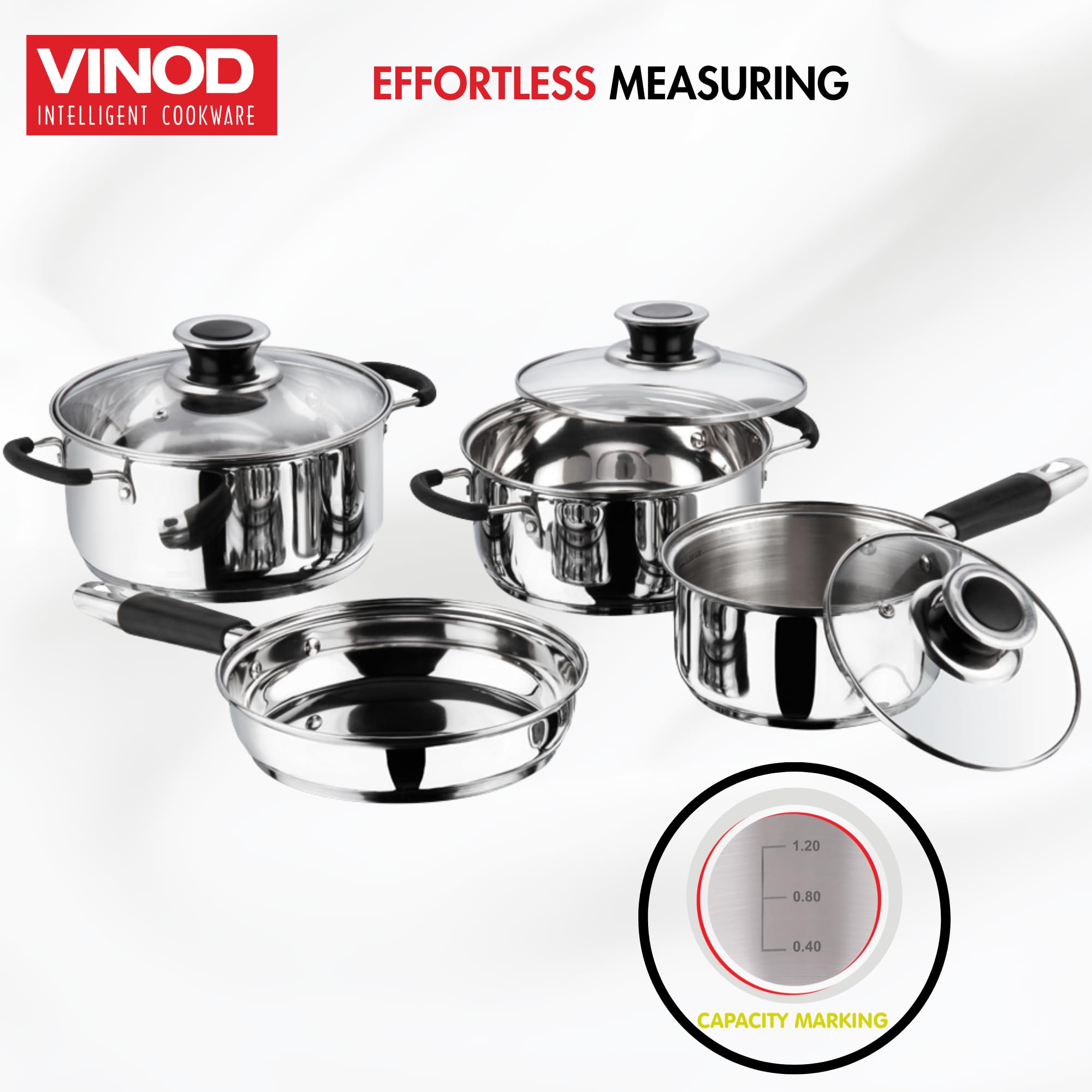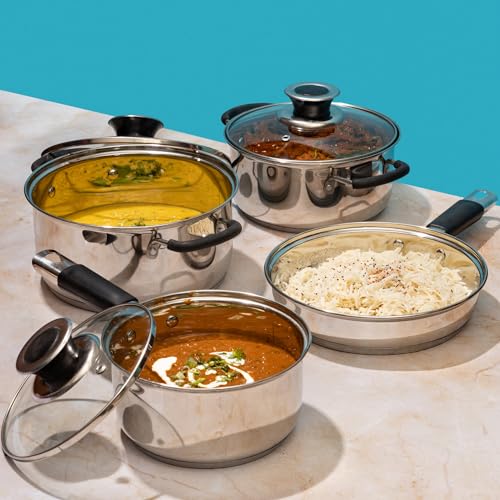 Vinod Stainless Steel Induction and Gas Stove Friendly Master Chef Cookware Set- 4Pieces, Saucepan (16 cm/1.5 Litre), Casserole (18 cm /2.1 L Kadai (20 cm/ 2 Litre) with Glass Lids, Frypan (20 cm)
