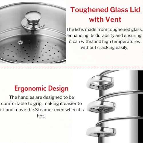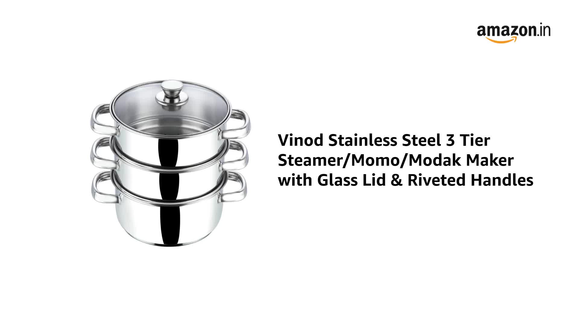 Vinod Stainless Steel 3 Tier Steamer/Momo/Modak Maker with Glass Lid & Riveted Handles- 20 cm (Induction and Gas Stove Friendly), 2 Year Warranty, Silver