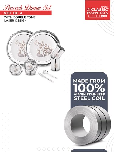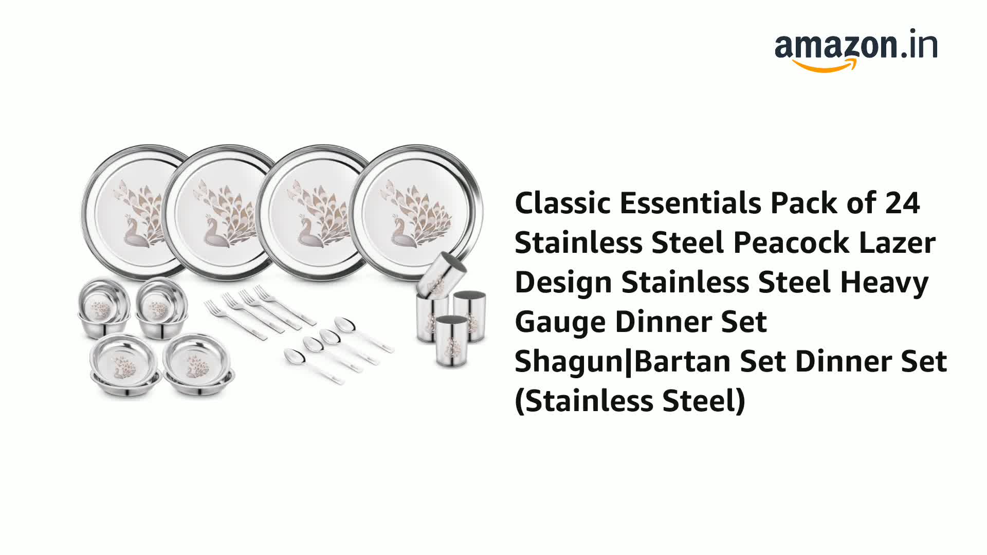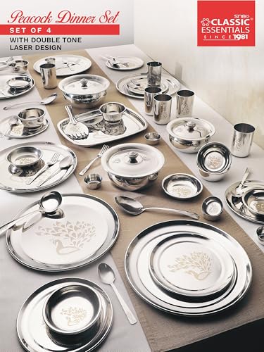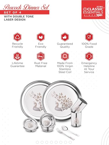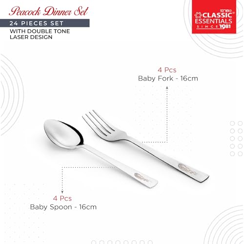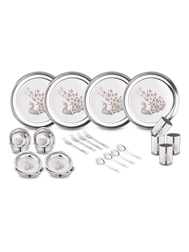 Classic Essentials Stainless Steel Dinner Set|Serves 4 People|Heavy Gauge|Kitchen Set|Permanent Laser-Peacock Set of 24