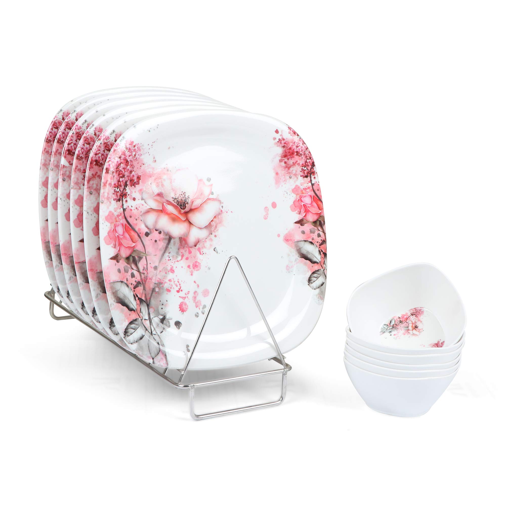 Golden Fish Beautiful Flower Printed Melamine Square Dinner Plate and Veg. Bowl (Pink, 11 Inches) - Set of 6 Both