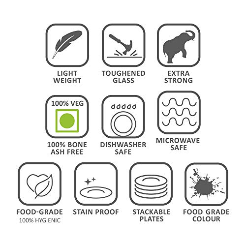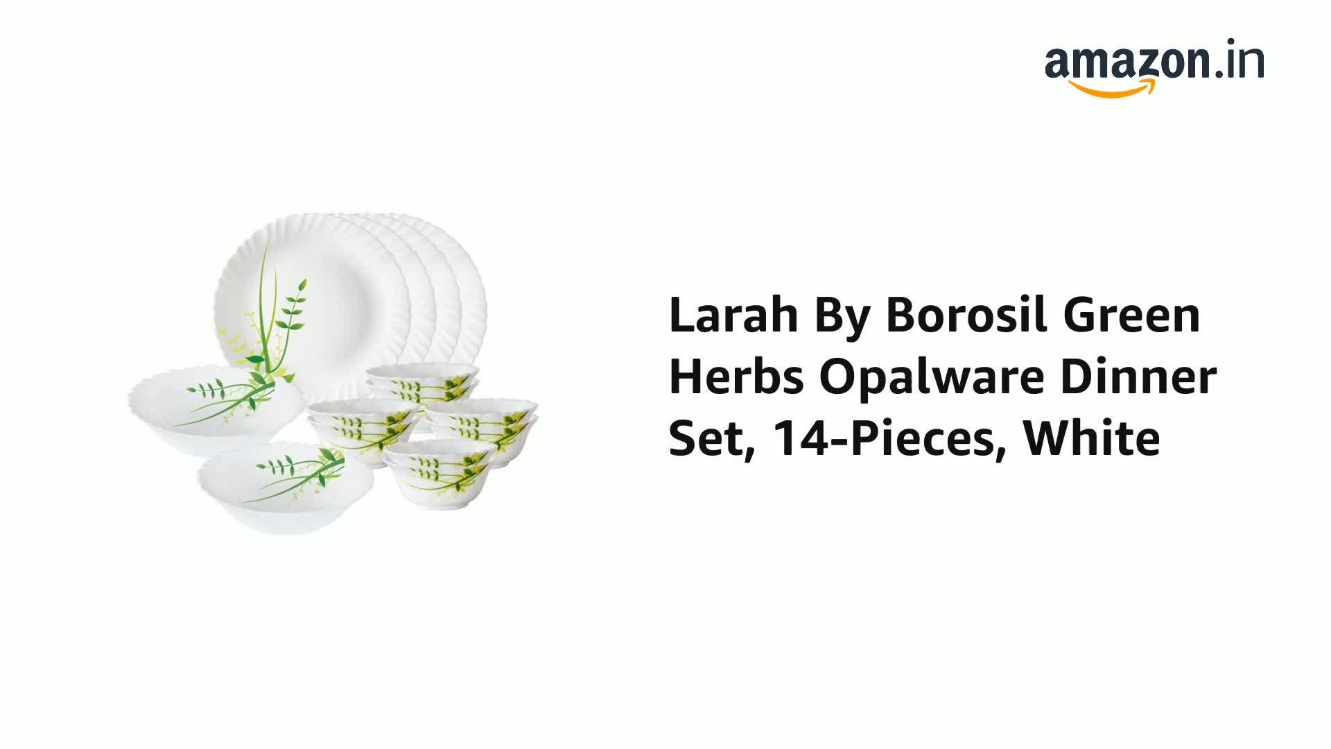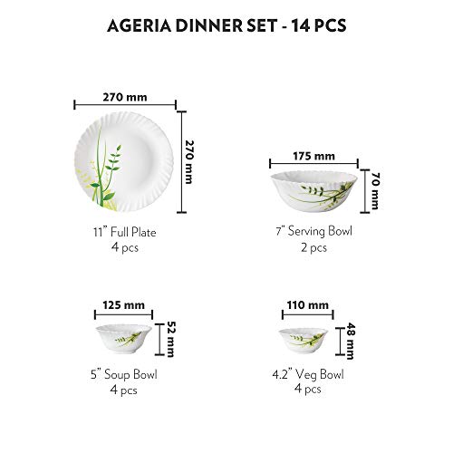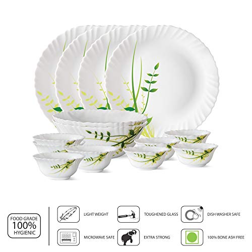 Larah by Borosil Green Herbs Opalware Dinner Set, 14-Pieces, White