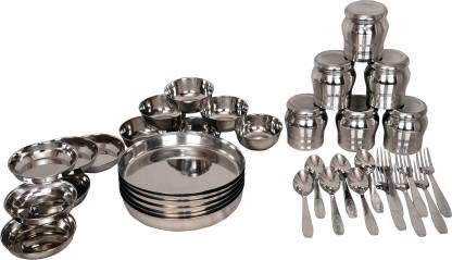 LiMETRO STEEL Stainless Steel 36 Pcs Dinner Set (6 Dinner Plates 6 Spoons6 Glasses 6 Bowls 6 Fork 6 Halva Plates) Dinner Set