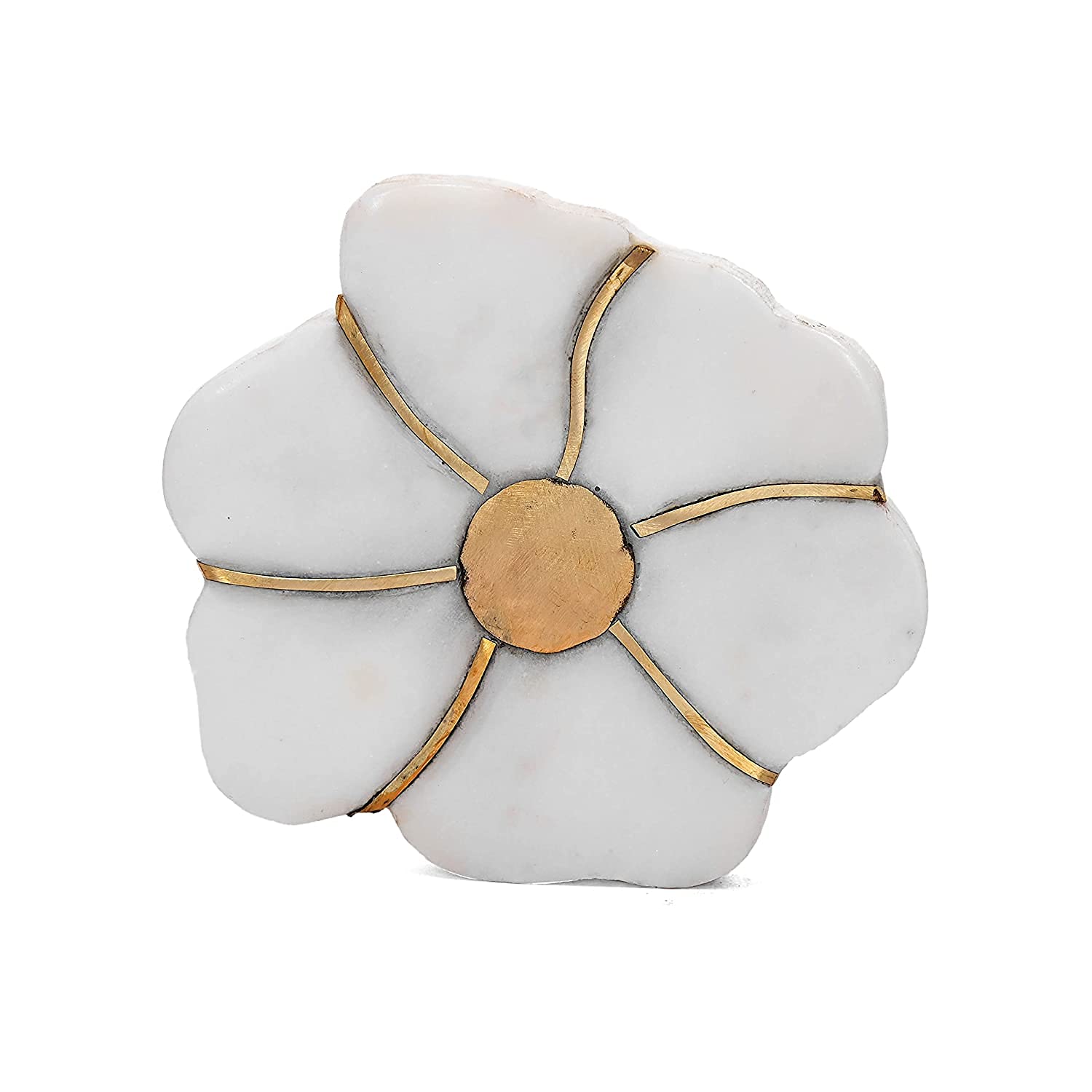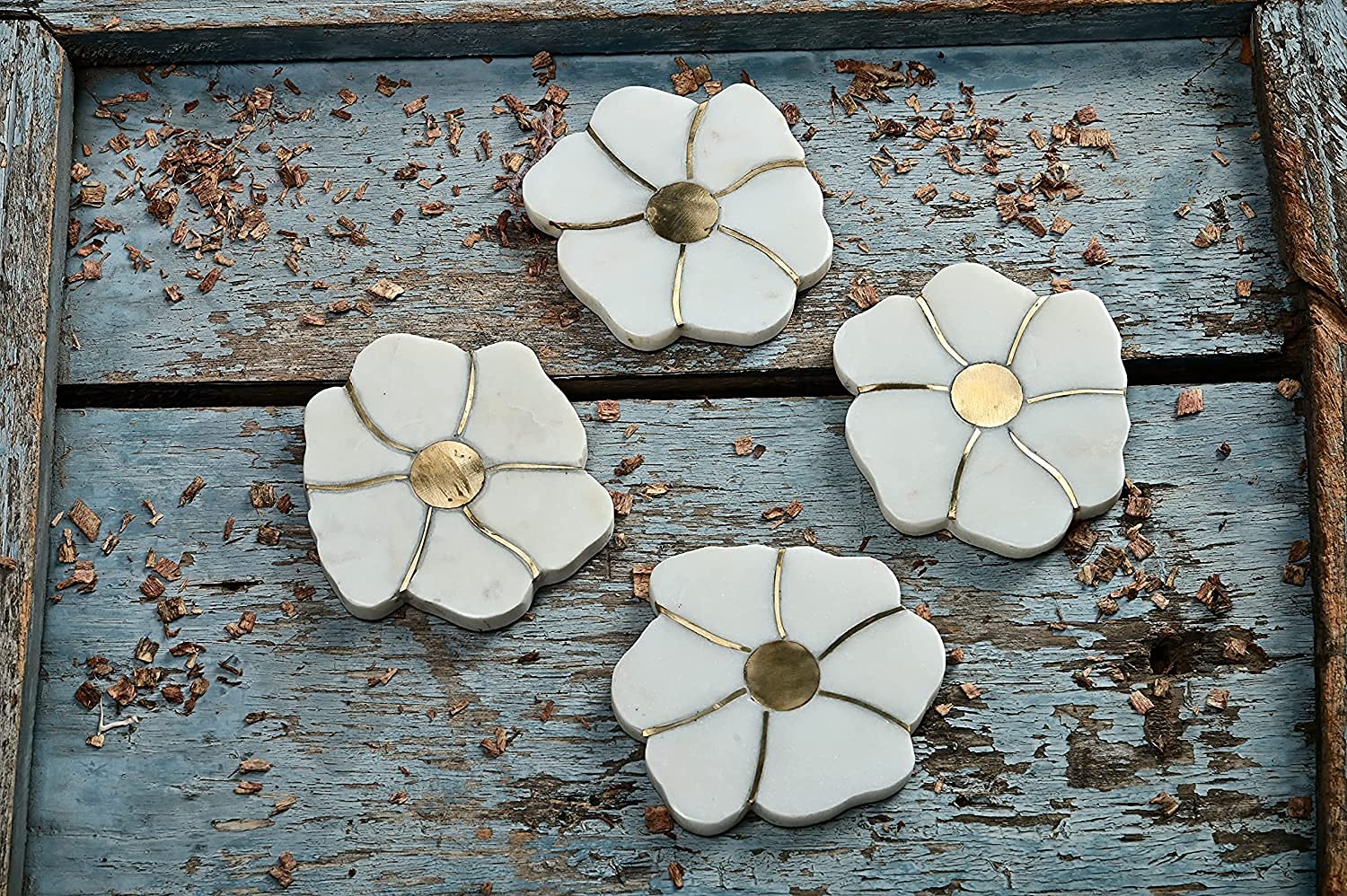 HomeKitchenDining setsCoaster SetAGRA SOFT STONE CARVING PRODUCTS Marble Flower Design Brass Work Handmade Coasters for Tea/Coffee/Cocktail etc (Set of 4)