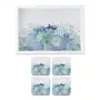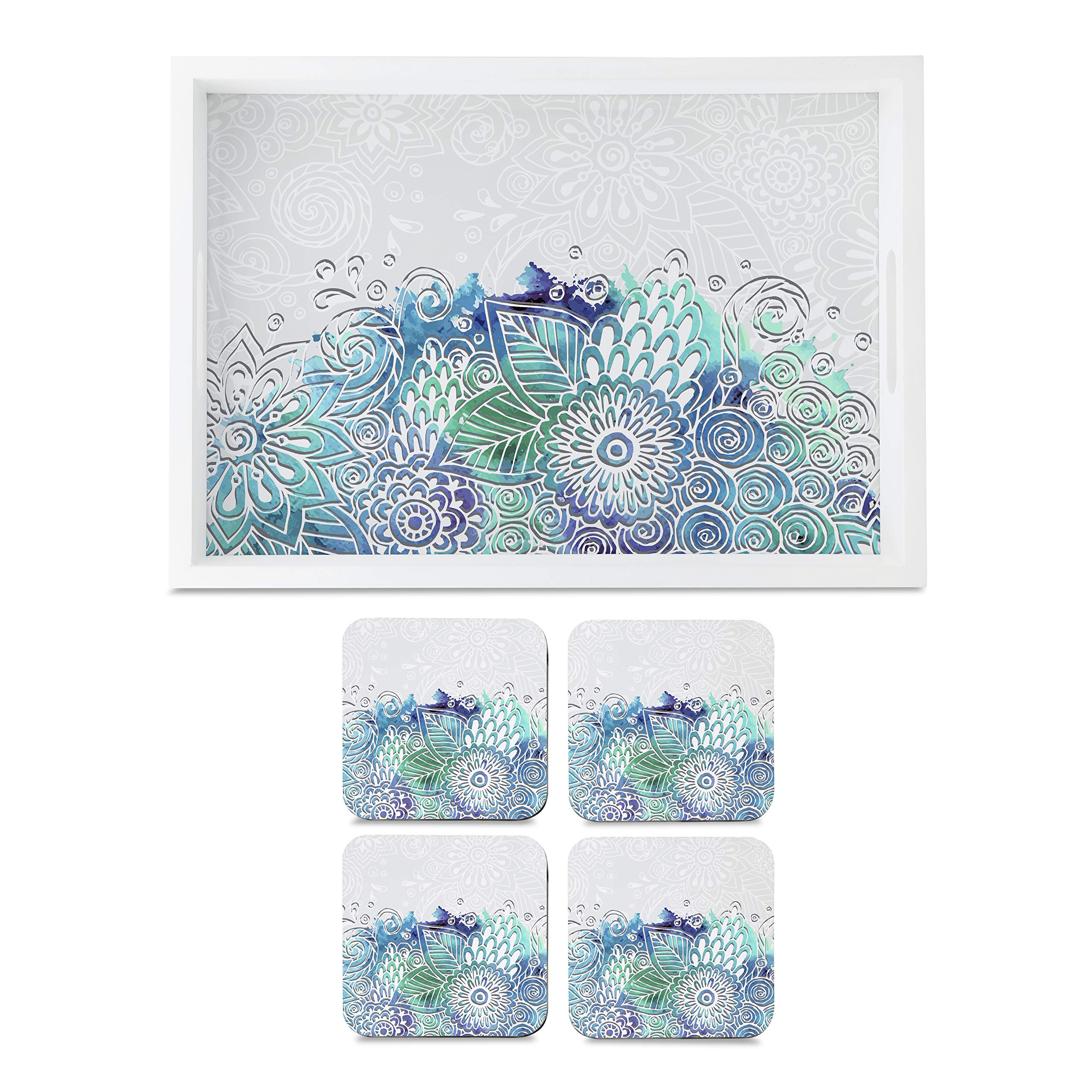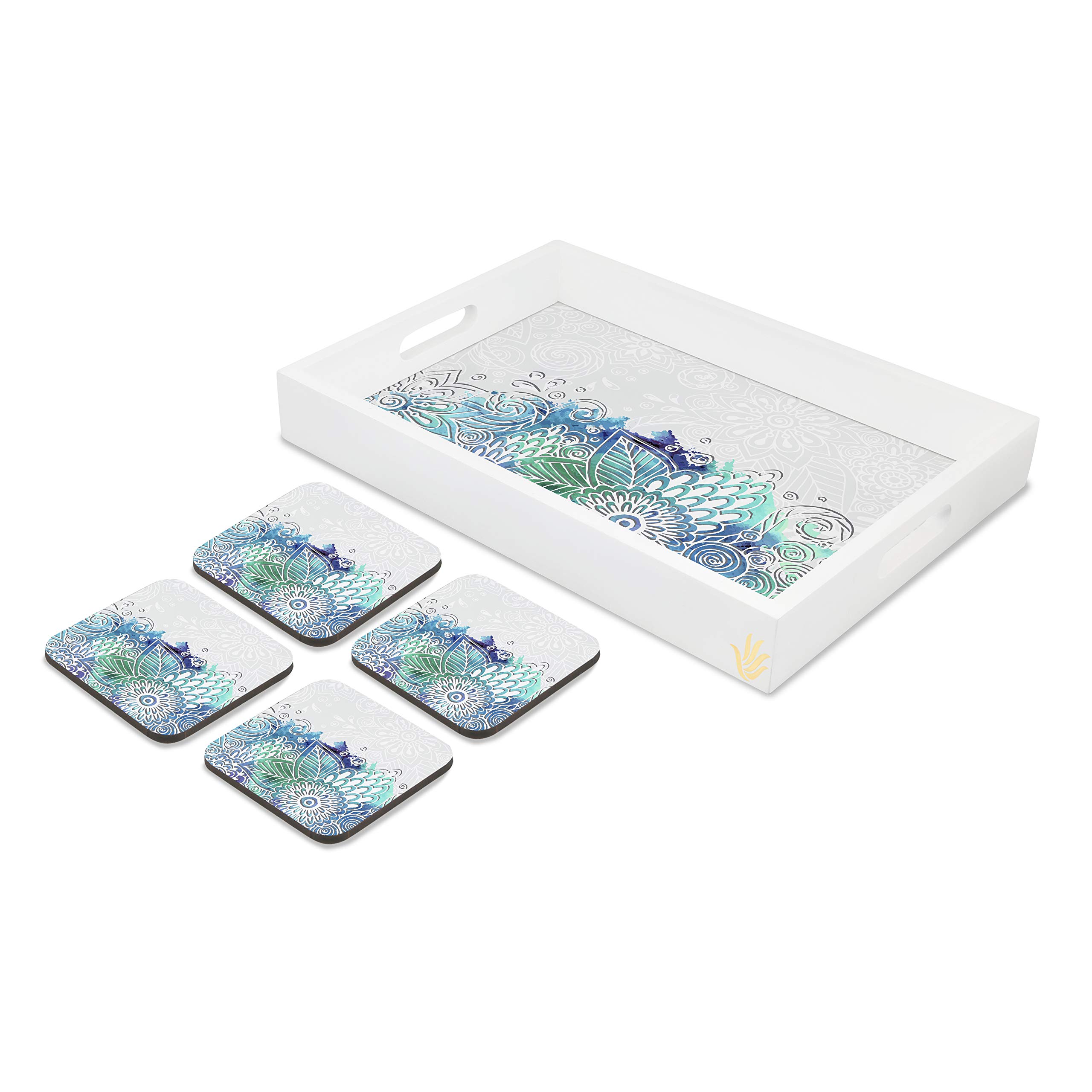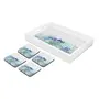 HomeKitchenDining setsCoaster SetBIJNOR - METAL INLAY IN WOOD Tray & Coaster Set Abstract Flowers Design - Combo Offer. Kitchen Dining Serving & Desk Set of 1 Tray 10" x 14" and 4 Tabletop Square Drinks Coasters 3.75" x 3.75" Made in Wood