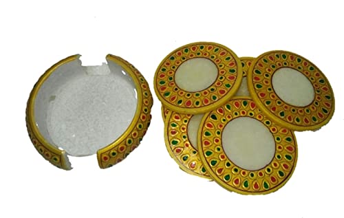 MARBLE INLAY ART AGRA - PACCHIKARI Marble Coaster 6 Pieces Elegant Table top Inlay Work Round Shape 4 inch 10 cm
