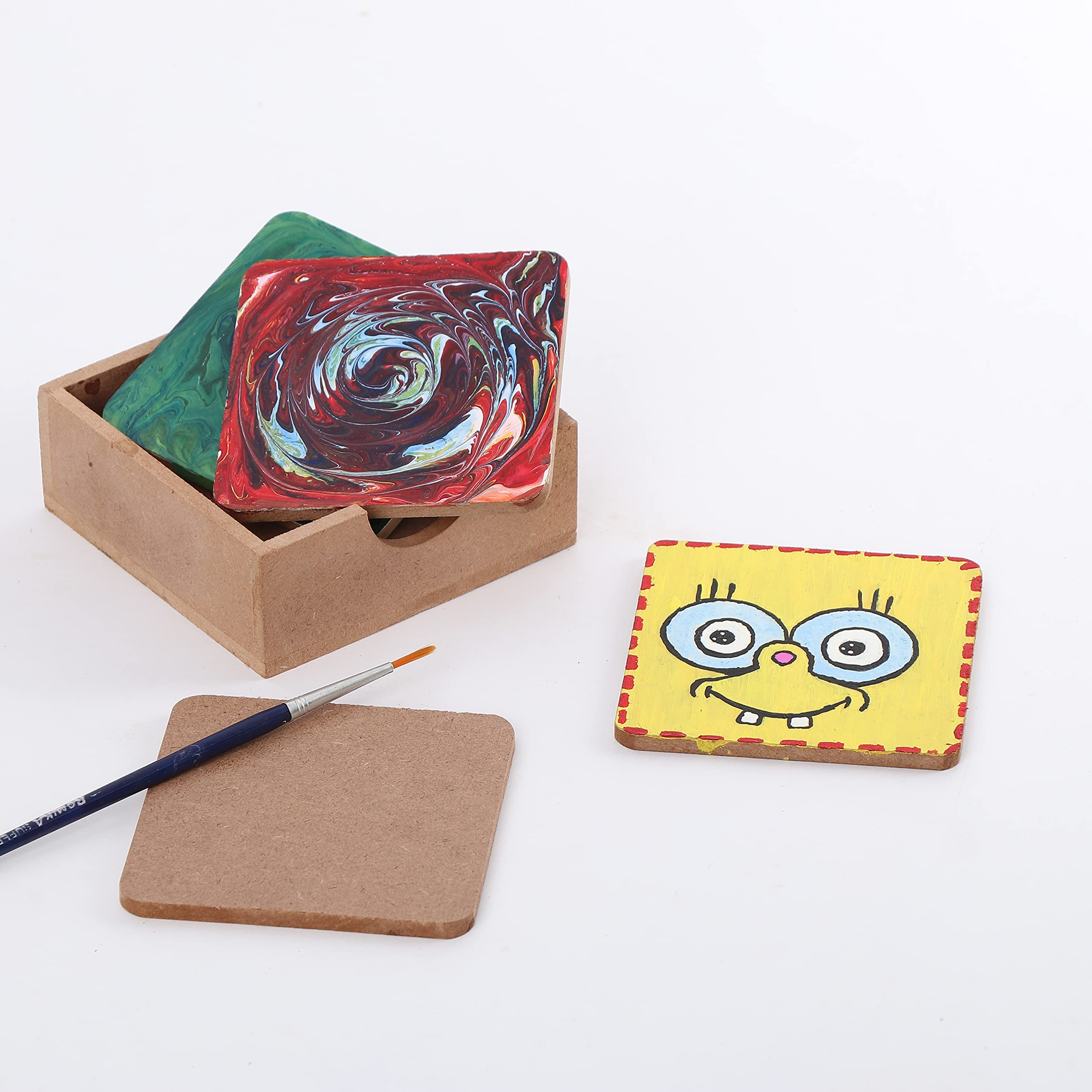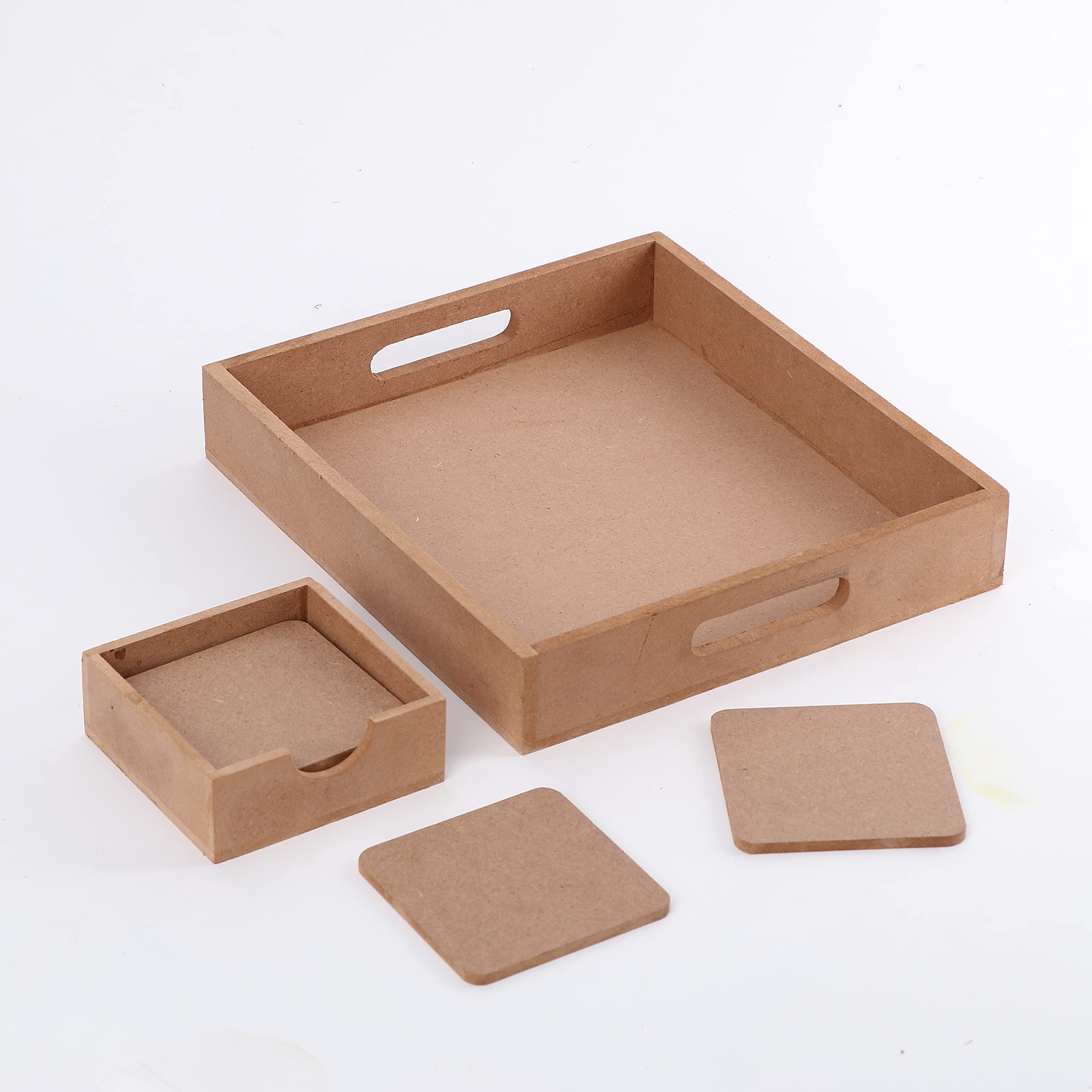 SAHARANPUR HANDICRAFTS DIY Tray in MDF (10in by 9 in) with 6 Square Coasters with Case| Tray for Painting Wood Sheet Craft Decoupage & Decoration | Plain MDF Tray for Painting (10x9 Tray & 6 Square CoasterswithCase)