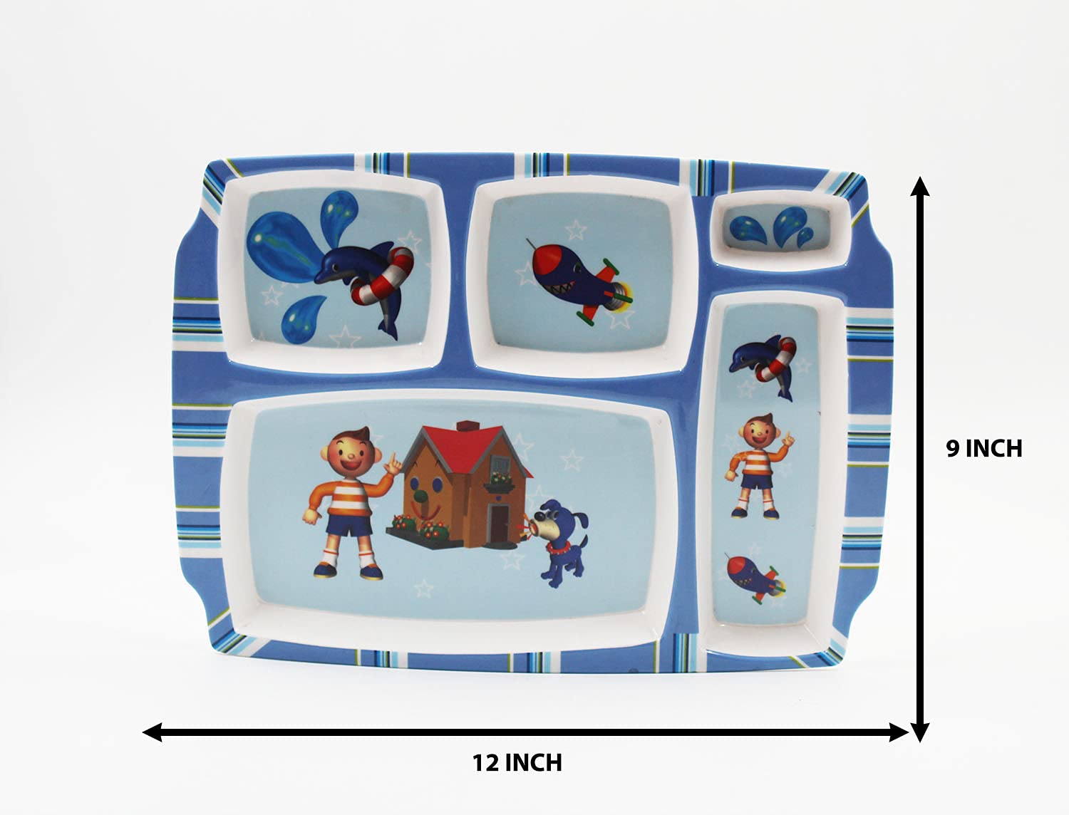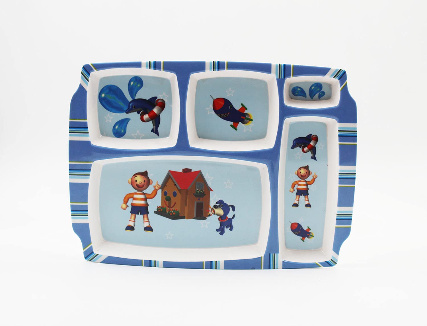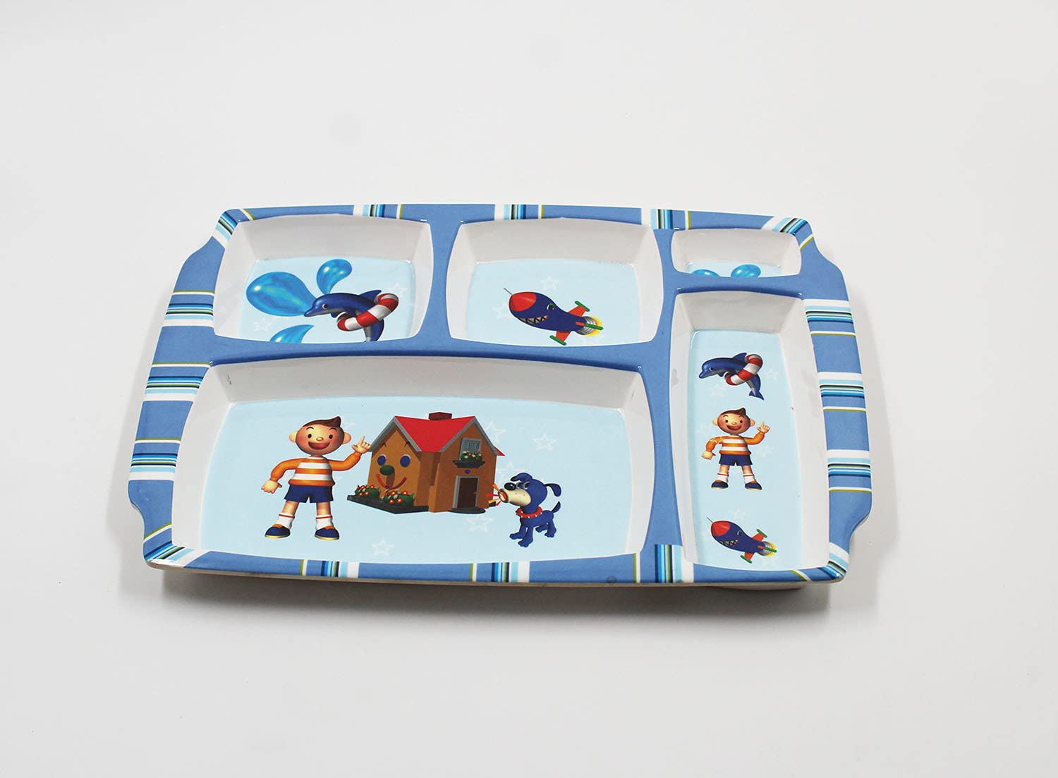 HomeKitchenServeware setsPlatesSAHARANPUR HANDICRAFTS Melamine Kids Plate | Rectangular 5 Section Multicolor Plate with Funny Cartoon Prints for Boys and Girls| Food Serving Plate with Partition (Nodee Kid)