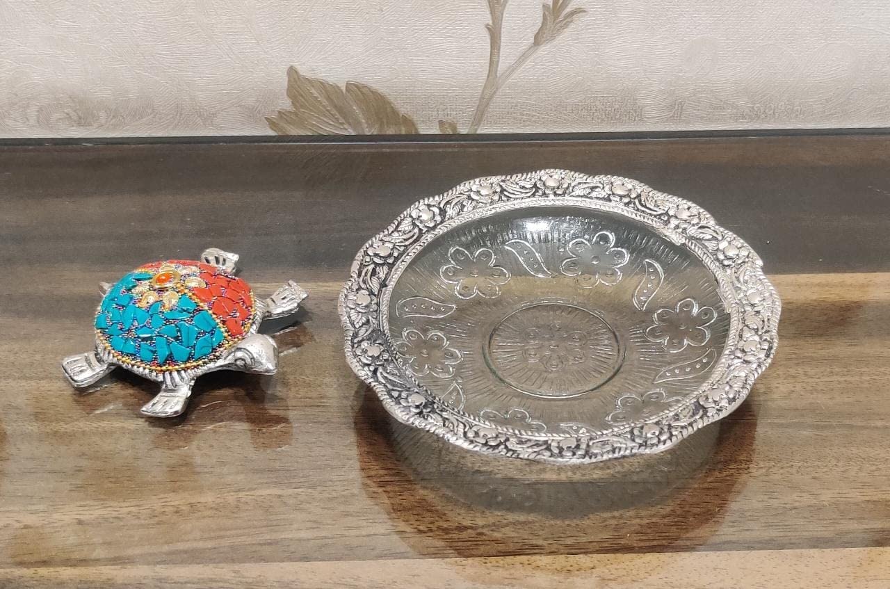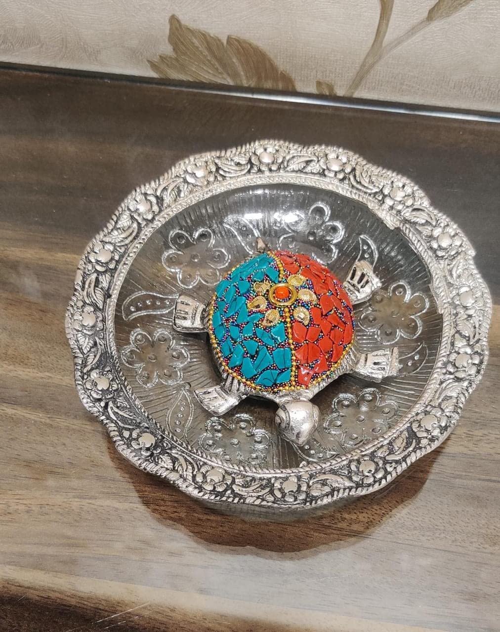 HomeKitchenServeware setsPlatesTIBETAN SILVER ENGRAVING PRODUCTS German Silver Feng Shui Tortoise with Semi Precious Stone Work Showpiece for Good Luck (TORTOSE Plate 6.5 INCH)