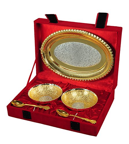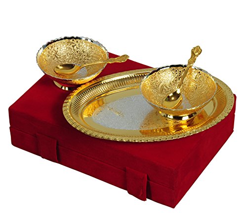 RAJASTHANI METAL HANDICRAFTSSilver Gold Plated Brass Bowl with Oval Tray Set of 5 Pcs with Velvet Box