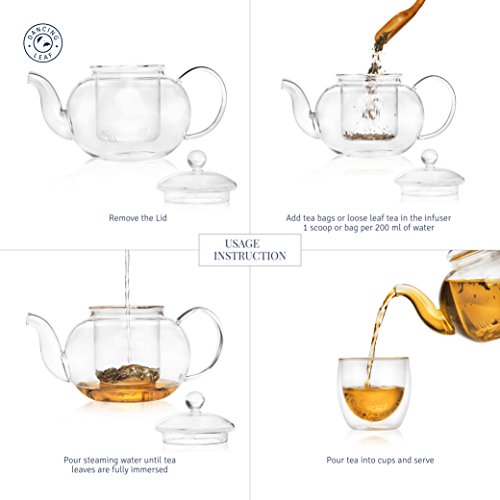 Clasico Glass Tea Pot with Removable Glass Infuser & Matching Lid | Heat Resistant Borosilicate Glas