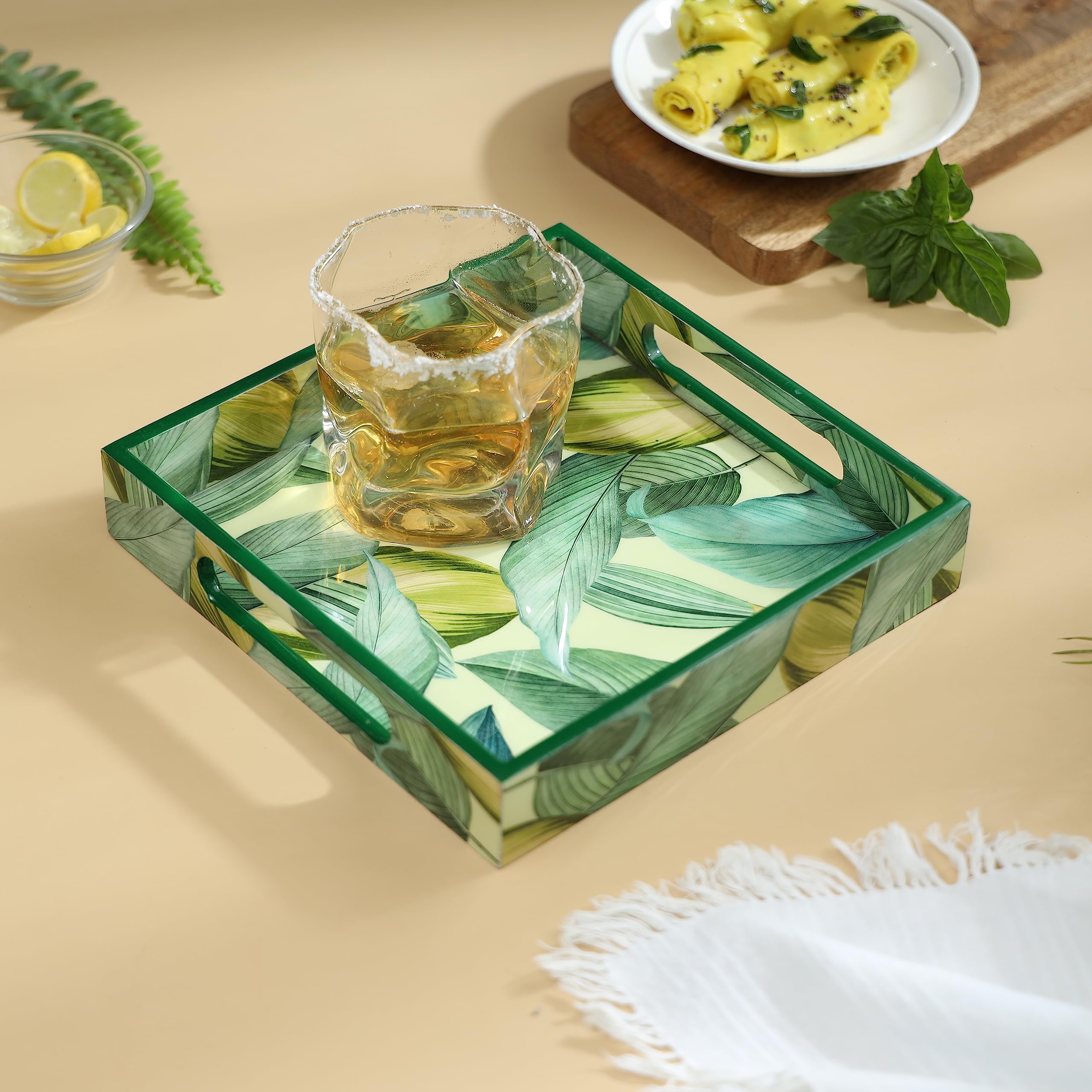 SAHARANPUR HANDICRAFTS Enamel Coated Multipurpose Tray in MDF | Serving Tray for Home & Dining Table | Multipurpose Tray | Water & Heat Resistant Durable (8x8Tray: BigLeaves)