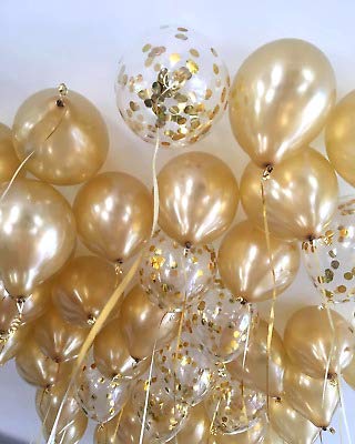 Luxurious colors in 5 each of metallic latex balloons 3 pieces of clear balloons prefilled with gold confetti pieces 1 pieces of bright hert foil balloons