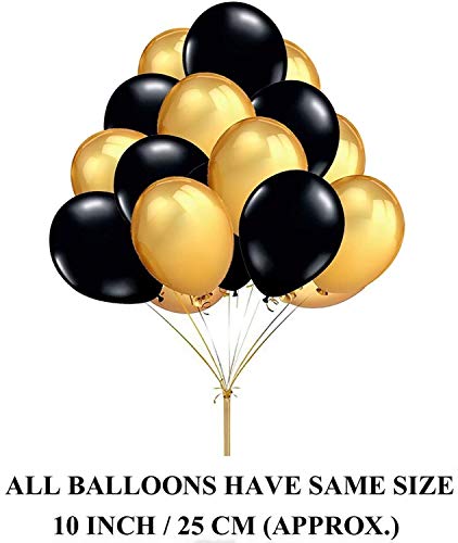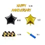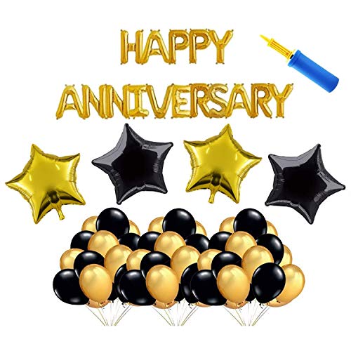 Package included: 50 Pic Metallic Balloons (25 Pic Golden + 25 Pic Black) + 4 ps Star Foil balloons (2 Golden + 2 Black) + 16 Letter (Happy Anniversary foil balloons) + 1 Free Air Pump