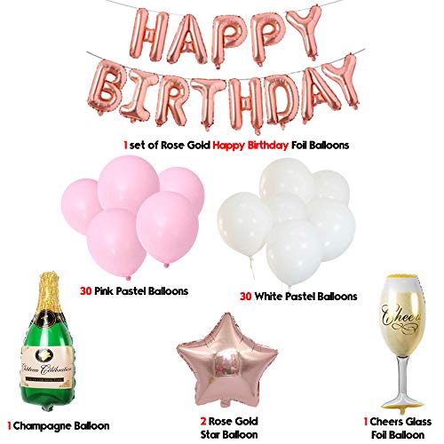 Elegant 64 Items Happy Brthday Decoration Kit - Rose Gold 1 Glass Champagne Star 30 Pink and 30 White Pastel Balloons