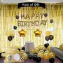 Package: HAPPY BrthDAY Letter Foil Balloon x 13pcs(16 Inch) · 3 Gold Foil Curtain (3 x 6 feet each) ¹ 50 Metallic Balloons(Golden and Black) º 2 Gold Star(18 Inches) shaped Foil Balloons » 10m white Ribbon with Straw x 5 pcs.