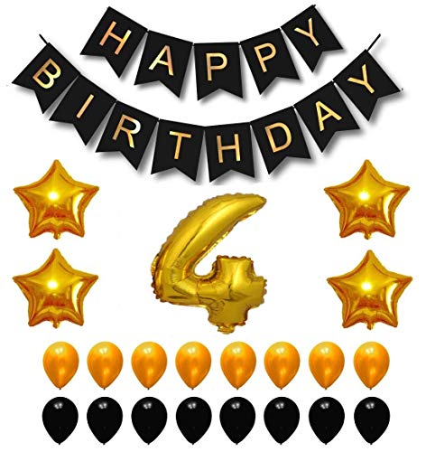 Happy Brthday Party Balloons Supplies & Decorations Set(Gold Number Foil Balloon+50 Gold & Black Latex Balloon+1 Black Happy Brthday Banner+ Four Gold Star Foil Balloons)- 4th Year