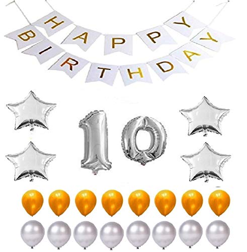 Package Contains : ( Silver 10 Numerical Number 4 Foil Balloon Stars 25 Gold Latex and 25 Silver Latex Balloon ( 10 th Year)