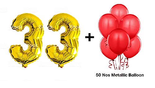 Number 33 Gold Foil Balloon and 50 Nos Red Color Latex Balloon Combo