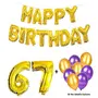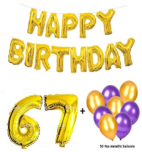 Number 67 Gold Foil Balloon and 50 Nos Purple and Gold Color Latex Balloon and Happy Brthday Gold Fo