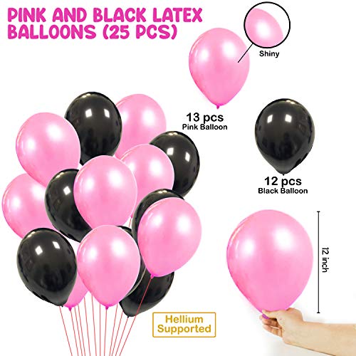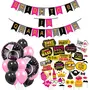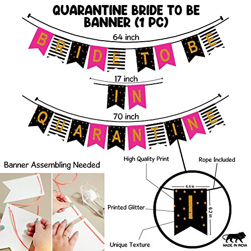 Package include 1pc Bride To Be Banner In Quarantine 34pcs photobooth props 2pcs bachelorette party foil balloons 13pcs pink and 12pcs black latex balloons.