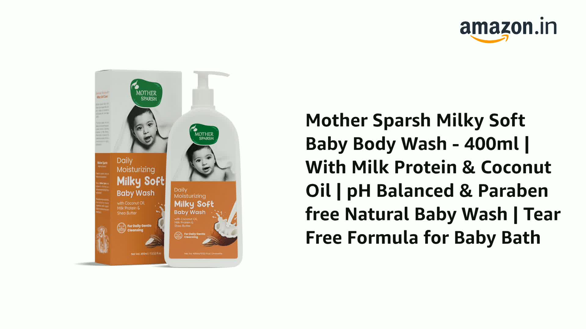Mother Sparsh Milky Soft Baby Body Wash - 400ml | With Milk Protein & Coconut Oil | pH Balanced & Paraben free Natural Baby Wash | Tear Free Formula for Baby Bath