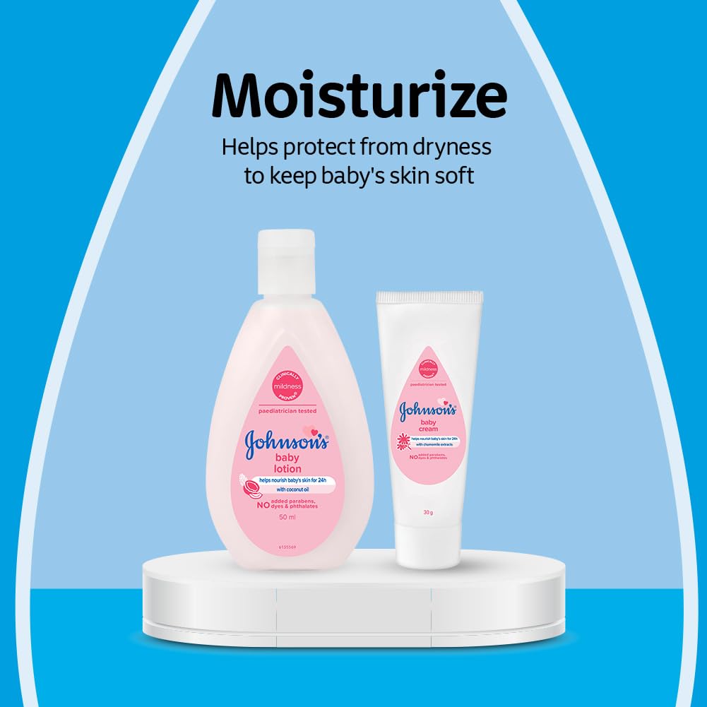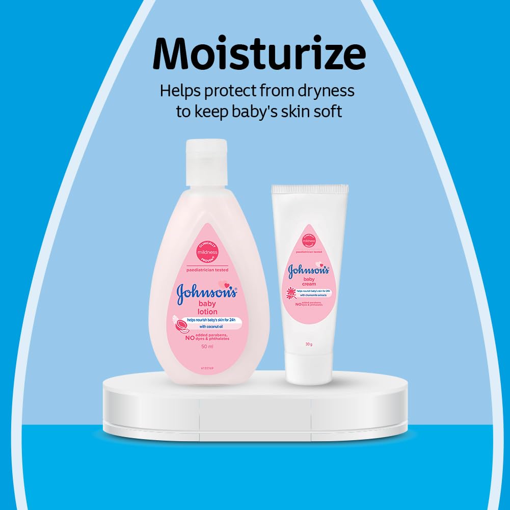 Moisturize with: Johnson's baby lotion and Johnson's baby cream- Helps protect from dryness to keep baby's skin soft Groom with Baby Comb-made with rounded edges especially for baby's delicate scalp Store baby essentials in a portable water-resistant baby
