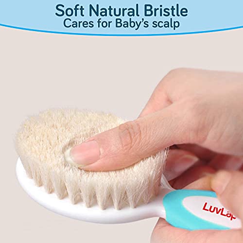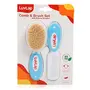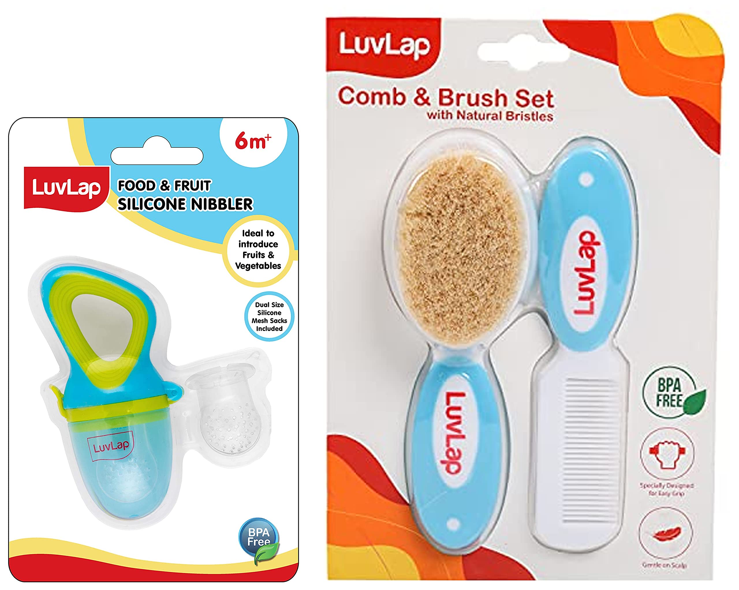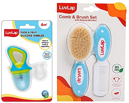 LuvLap Baby Comb with Rounded Tip & Baby Hair Brush (White & Blue) & Silicone Food/Fruit Nibbler wit