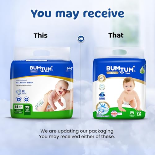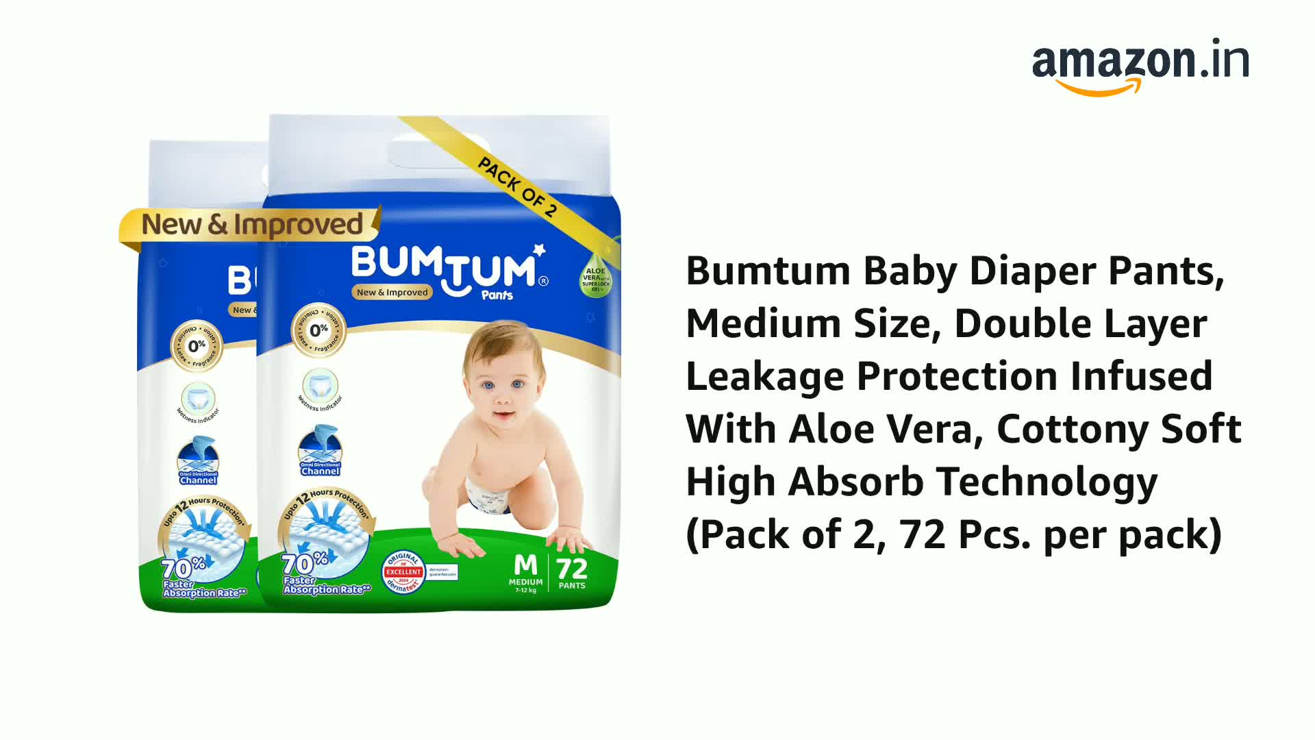 Bumtum Baby Diaper Pants, Medium Size, Double Layer Leakage Protection Infused With Aloe Vera, Cottony Soft High Absorb Technology (Pack of 2, 72 Pcs. per pack)