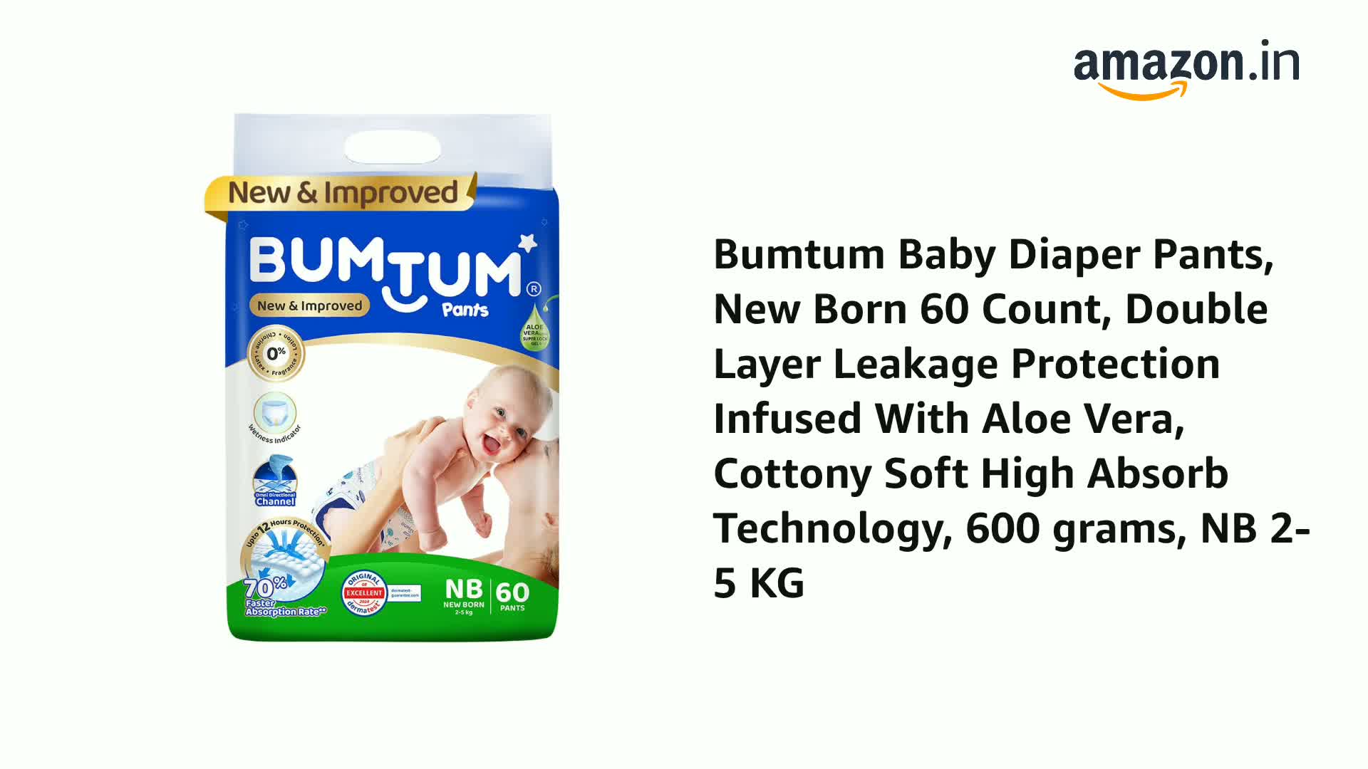 HomeBabyDiaperingBaby DiapersBumtum Baby Diaper Pants, New Born 60 Count, Double Layer Leakage Protection Infused With Aloe Vera, Cottony Soft High Absorb Technology, 600 grams, NB 2-5 KG