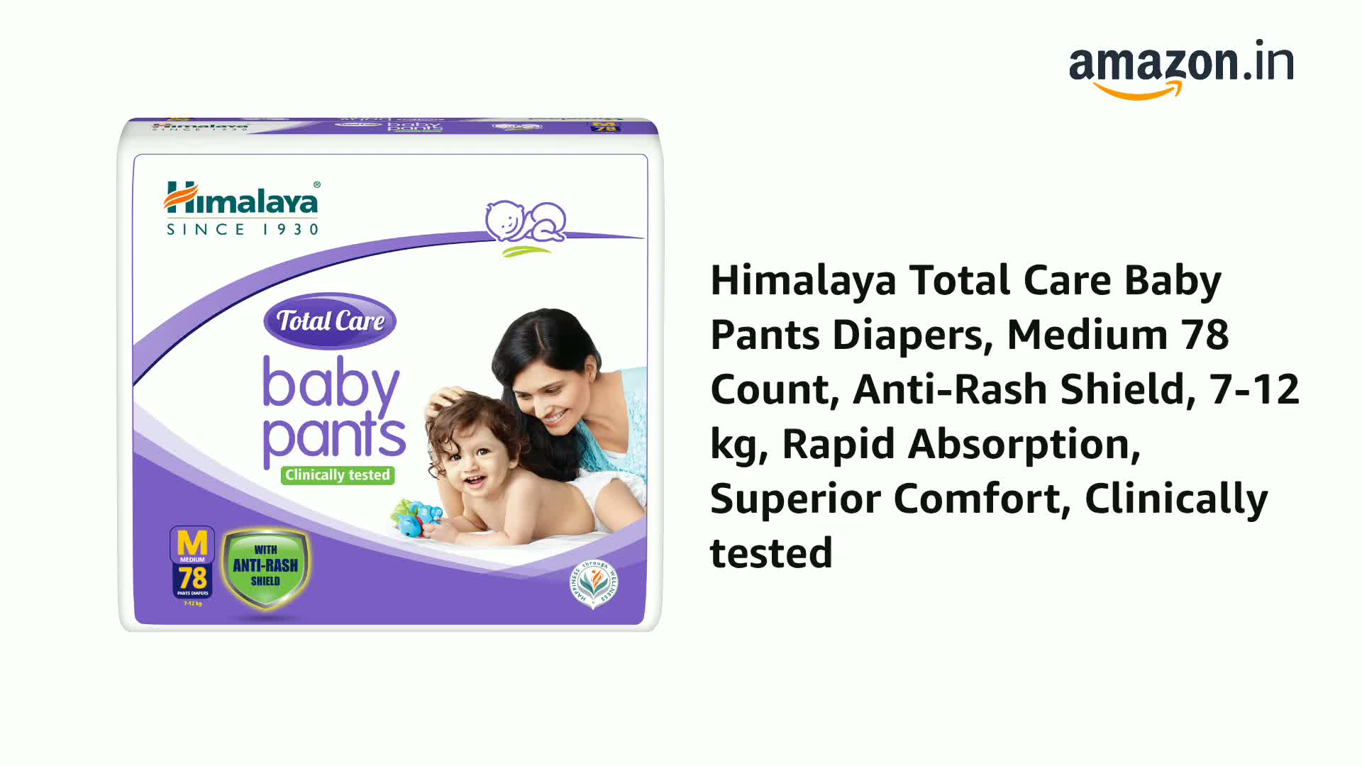 HomeBabyDiaperingBaby DiapersHimalaya Total Care Baby Pants Diapers, Medium 78 Count, Anti-Rash Shield, 7-12 kg, Rapid Absorption, Superior Comfort, Clinically tested