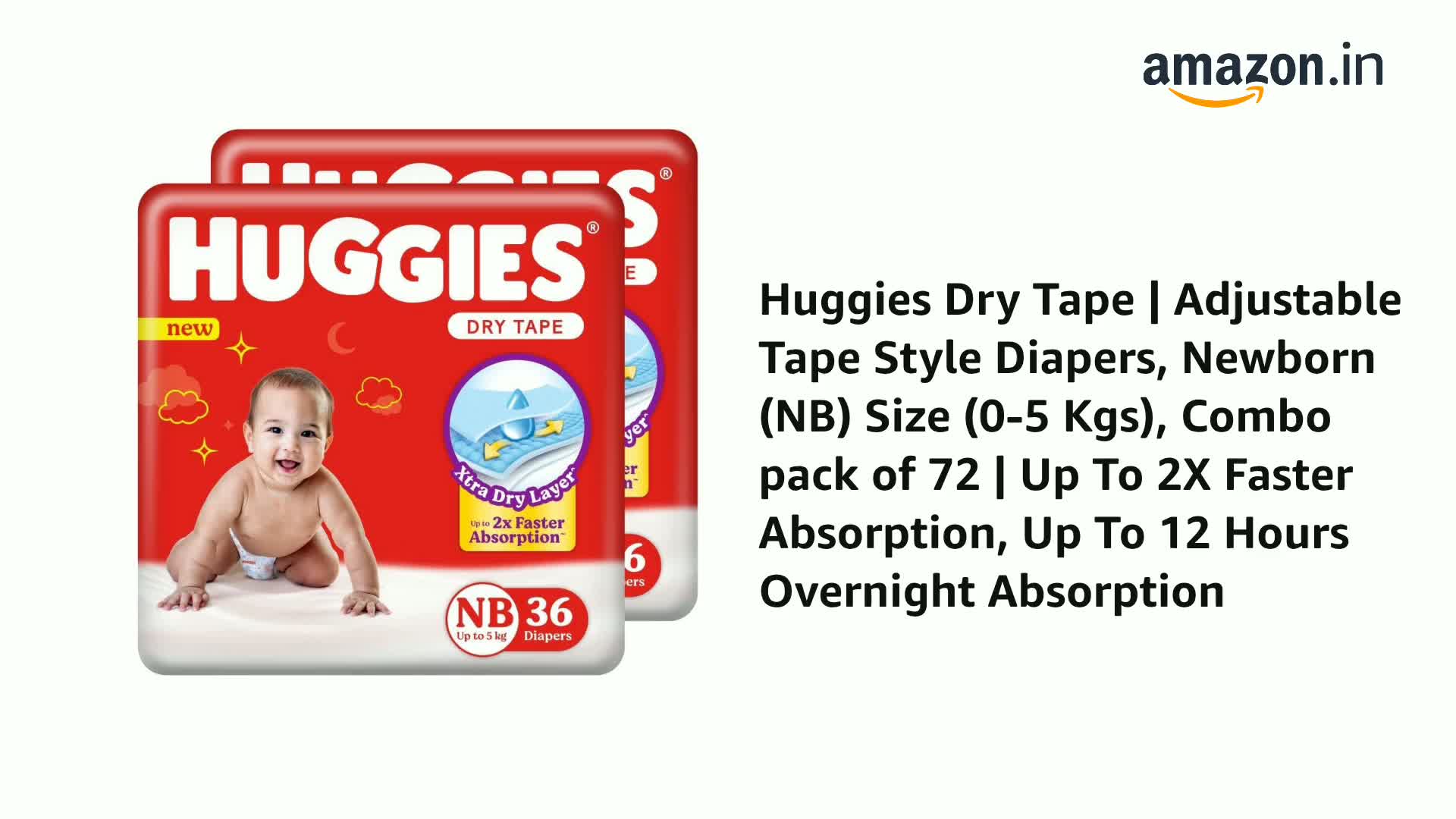 Huggies Dry Tape | Adjustable Tape Style Diapers, Newborn (NB) Size (0-5 Kgs), Combo pack of 72 | Up To 2X Faster Absorption, Up To 12 Hours Overnight Absorption