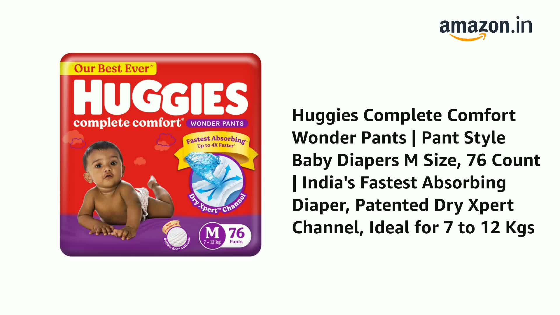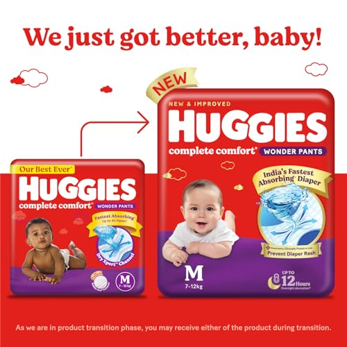 Huggies Complete Comfort Wonder Pants | Pant Style Baby Diapers M Size, 76 Count | India's Fastest Absorbing Diaper, Patented Dry Xpert Channel, Ideal for 7 to 12 Kgs