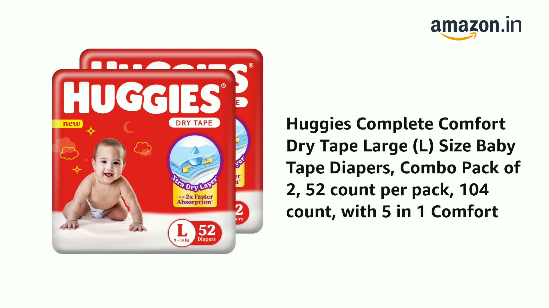 Huggies Complete Comfort Dry Tape Large (L) Size Baby Tape Diapers, Combo Pack of 2, 52 count per pack, 104 count, with 5 in 1 Comfort