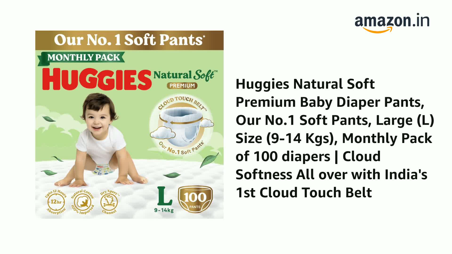 Our No.1 soft Pants: New & Premium Huggies Natural Soft comes with India's 1st Cloud Touch BeltTM with cloud softness all over to help prevent red marks; Large (L) Size (9-14 Kgs) Monthly Pack of 50x2 diapers
