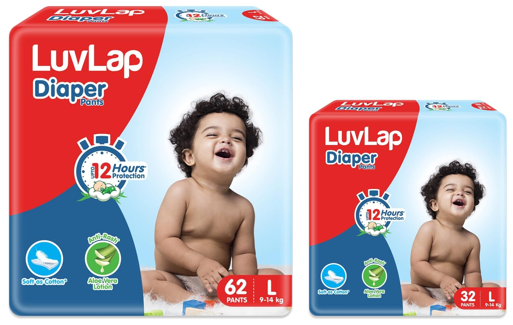 LuvLap Baby Diaper Pants, L Size (9-14kg), Pack of 62 Count & 32 Count, with Aloe Vera Lotion for rash protection, Upto 12Hr protection